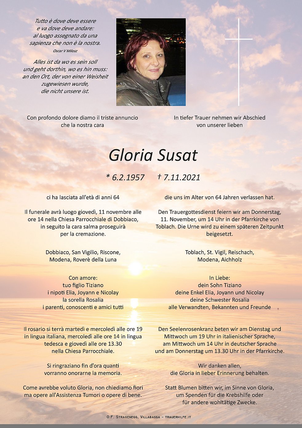 Come avrebbe voluto Gloria, non chiediamo fiori ma opere all'Assistenza Tumori o opere di bene.