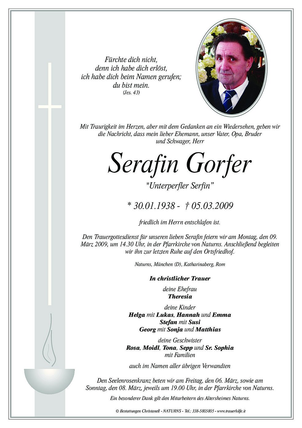 Den Trauergottesdienst für unseren lieben Serafin feiern wir am Montag, den 09. März 2009, um 14.30 Uhr, in der Pfarrkirche von Naturns. Anschließend begleiten wir ihn zur letzten Ruhe auf den Ortsfriedhof.