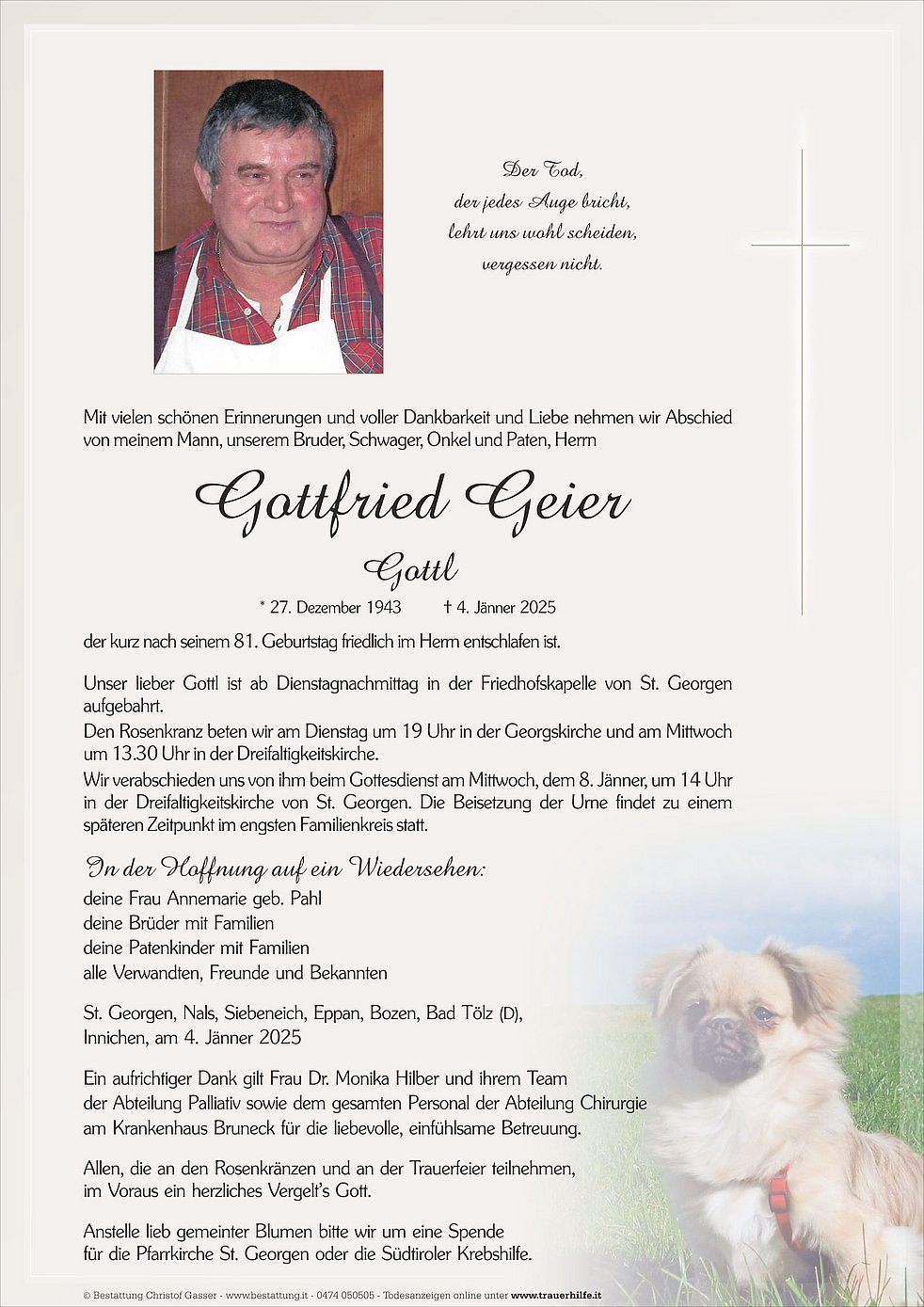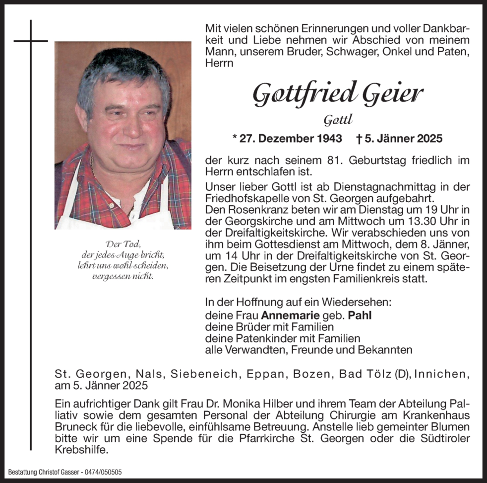Wir verabschieden uns von ihm beim Gottesdienst am Mittwoch, dem 8. Jänner, um 14 Uhr in der Dreifaltigkeitskirche von St. Georgen. Die Beisetzung der Urne findet zu einem späteren Zeitpunkt im engsten Familienkreis statt.