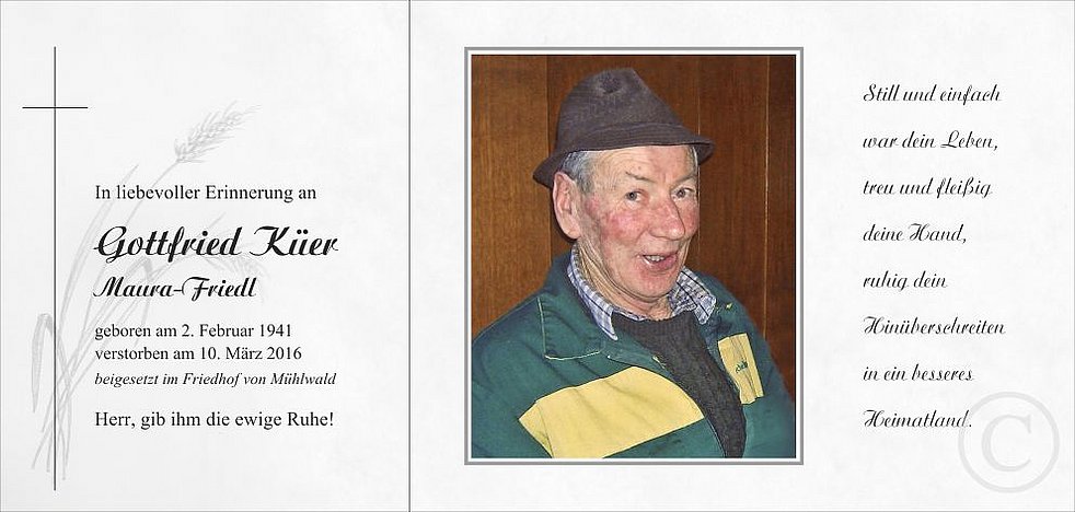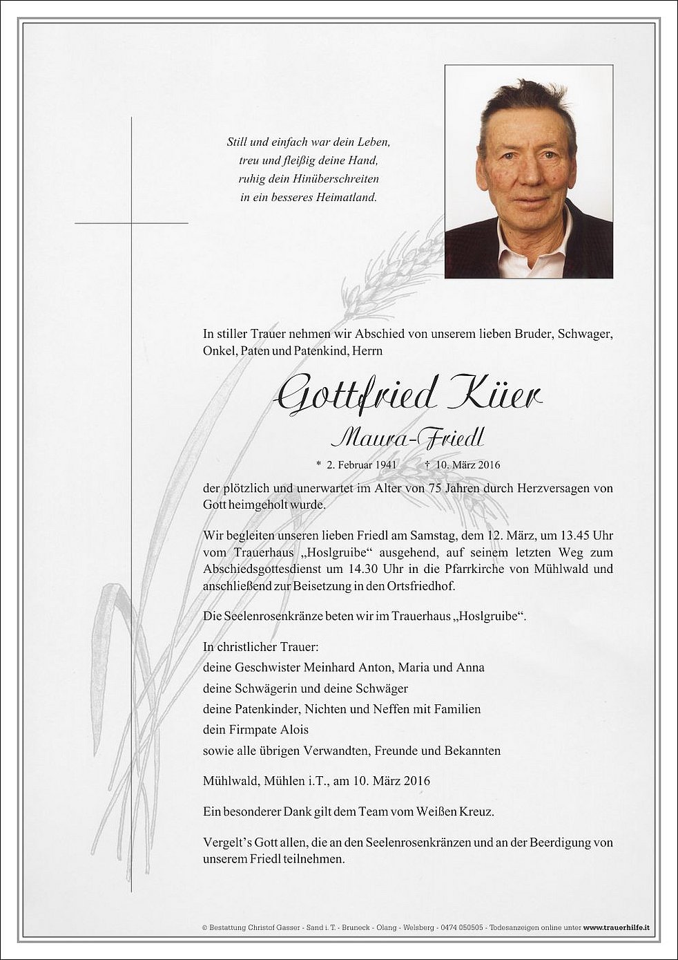 Wir begleiten unseren lieben Friedl am Samstag, dem 12. März, um 13.45 Uhr vom Trauerhaus „Hoslgruibe“ ausgehend, auf seinem letzten Weg zum Abschiedsgottesdienst um 14.30 Uhr in die Pfarrkirche von Mühlwald und anschließend zur Beisetzung in den Ortsfriedhof.