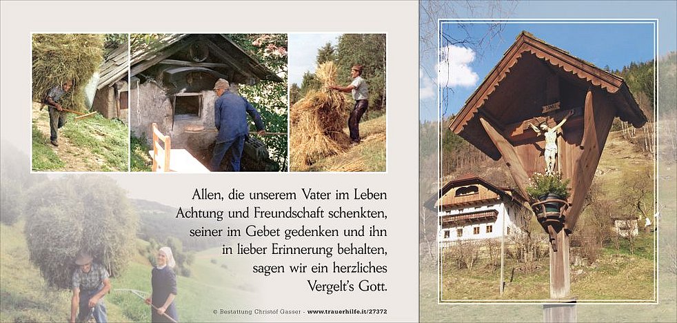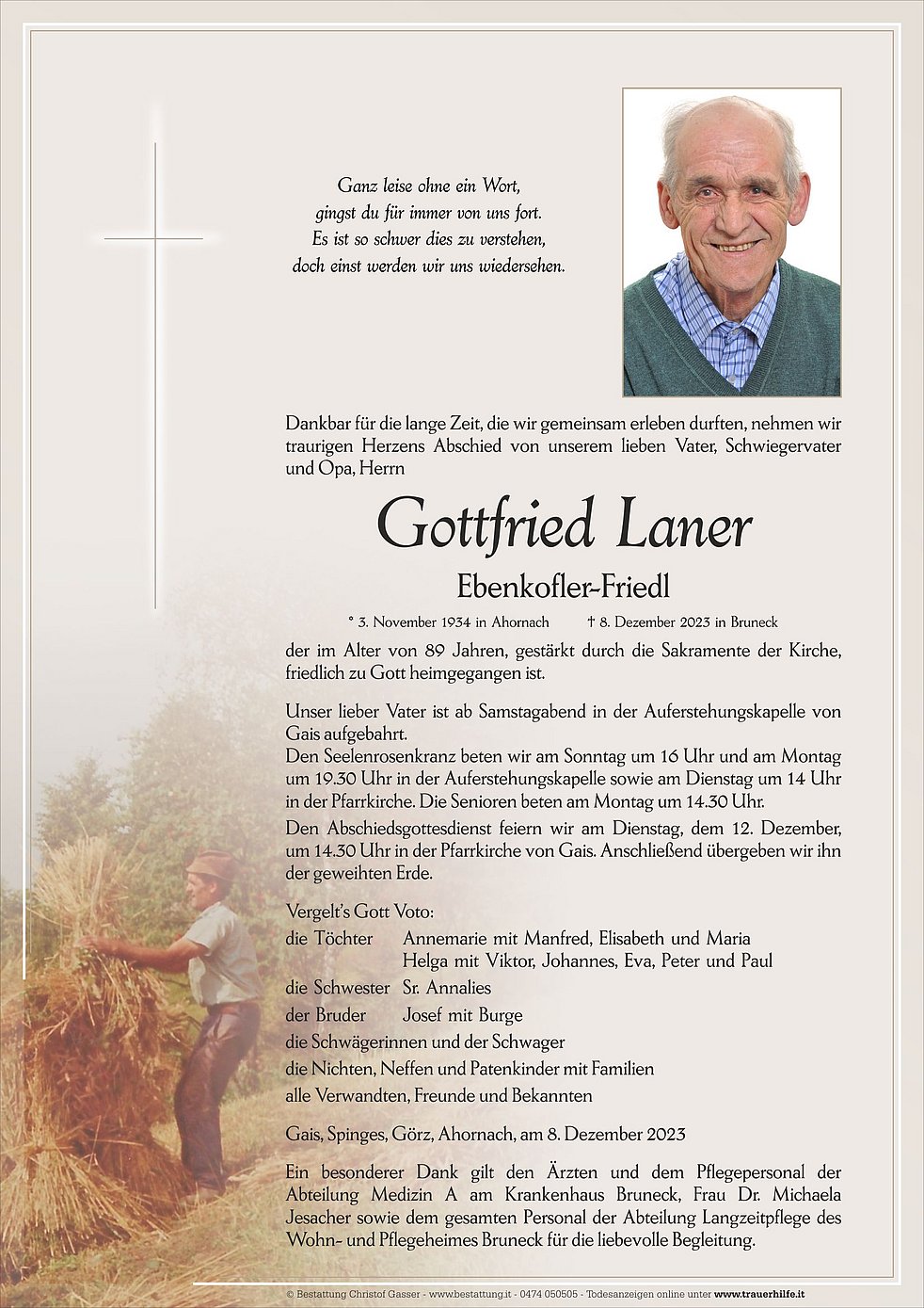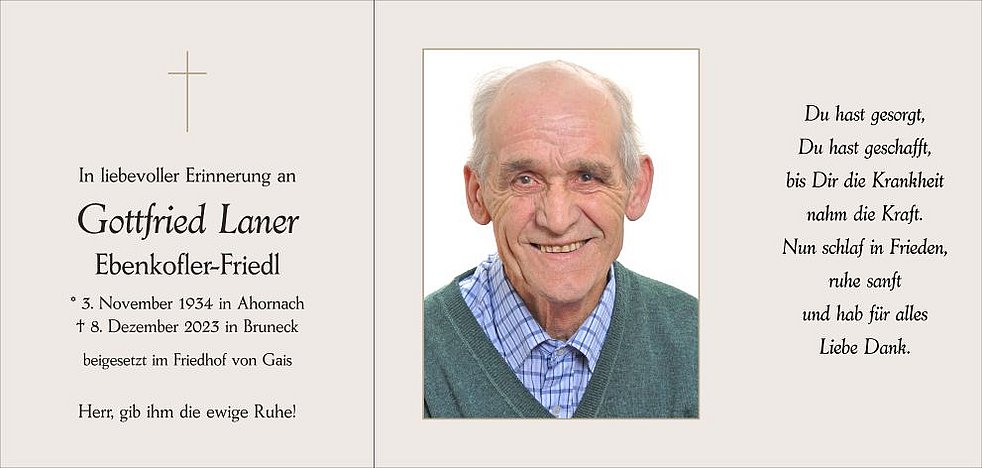 Den Abschiedsgottesdienst feiern wir am Dienstag, dem 12. Dezember, um 14.30 Uhr in der Pfarrkirche von Gais. Anschließend übergeben wir ihn der geweihten Erde.