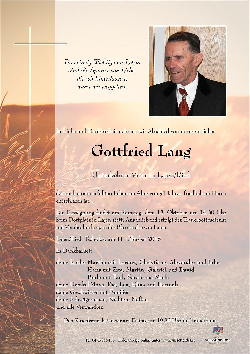 Die Einsegnung findet am Samstag, dem 13. Oktober, um 14.30 Uhr beim Dorfplatz in Lajen statt. Anschließend erfolgt der Trauergottesdienst mit Verabschiedung in der Pfarrkirche von Lajen.