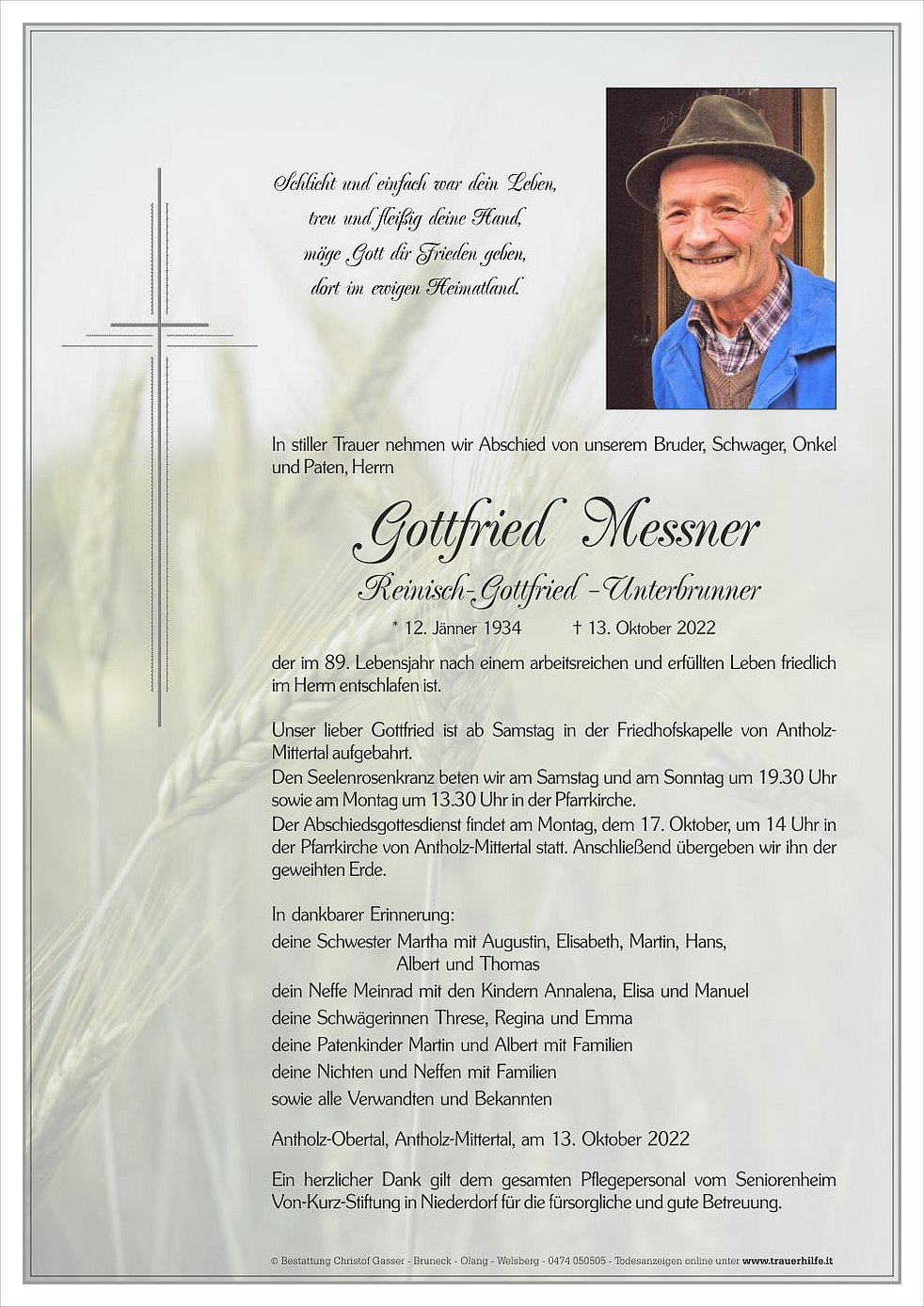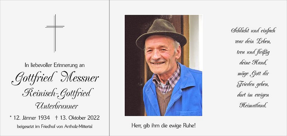 Gottfried kam 1934 als jüngstes von 11 Geschwistern in Antholz-Obertal zur Welt. Kurz nach seiner Geburt verstarb die Mutter und so mussten die Kinder früh mithelfen im Haus, Hof und Feld.