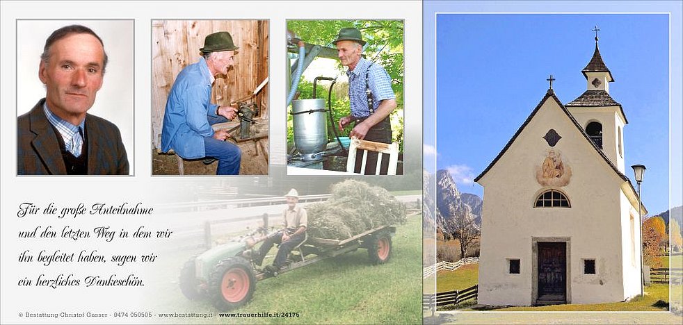 Der Abschiedsgottesdienst findet am Montag, dem 17. Oktober, um 14 Uhr in der Pfarrkirche von Antholz-Mittertal statt. Anschließend übergeben wir ihn der geweihten Erde.