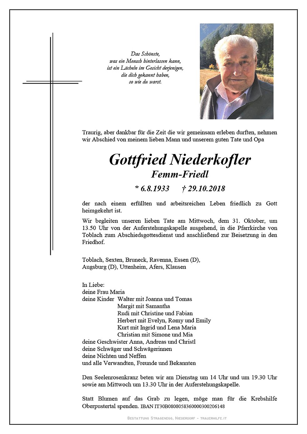 Wir begleiten unseren lieben Tate am Mittwoch, dem 31. Oktober, um 13.50 Uhr von der Auferstehungskapelle ausgehend, in die Pfarrkirche von Toblach zum Abschiedsgottesdienst und anschließend zur Beisetzung in den Friedhof.