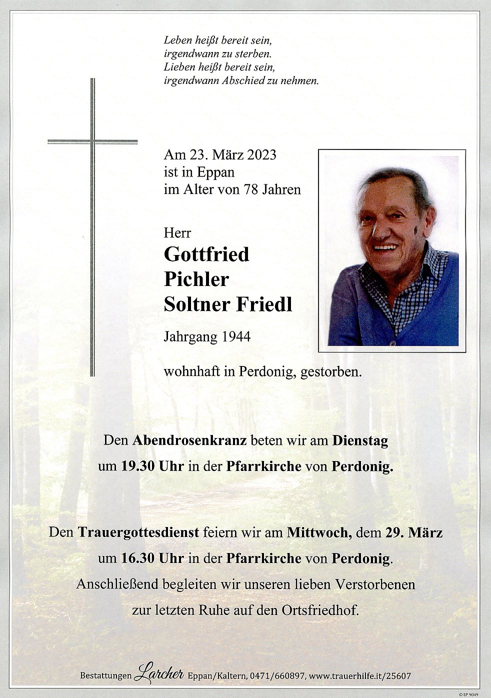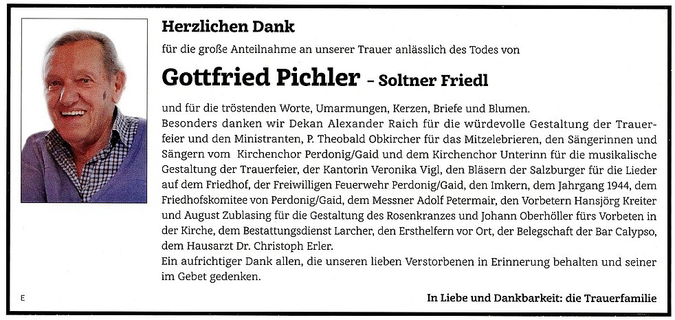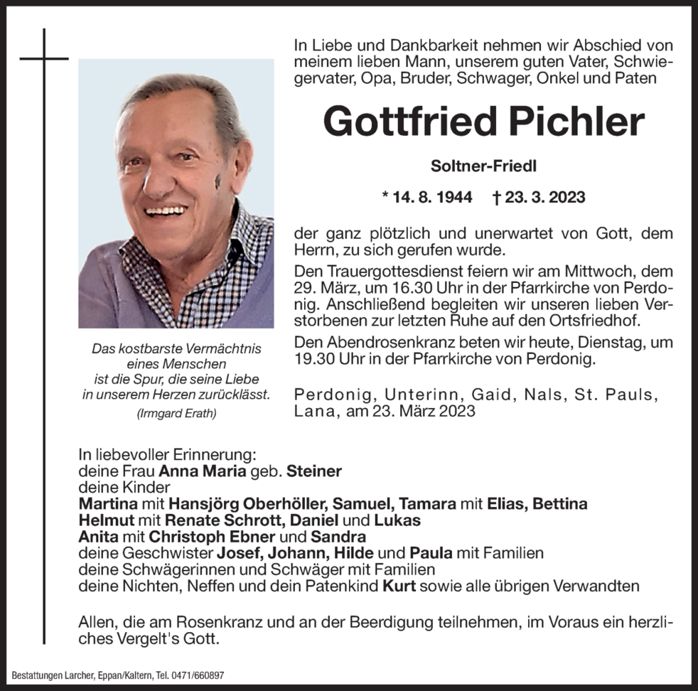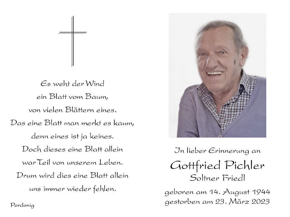 Den Trauergottesdienst feiern wir am Mittwoch, dem 29. März um 16.30 Uhr in der Pfarrkirche von Perdonig.
