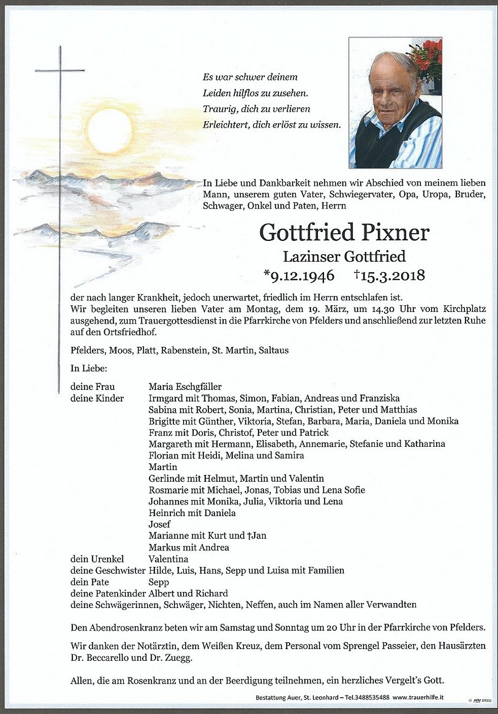 Wir begleiten unseren lieben Vater am Montag, dem 19. März, um 14.30 Uhr vom Kirchplatz ausgehend, zum Trauergottesdienst in die Pfarrkirche von Pfelders und anschließend zur letzten Ruhe auf den Ortsfriedhof.