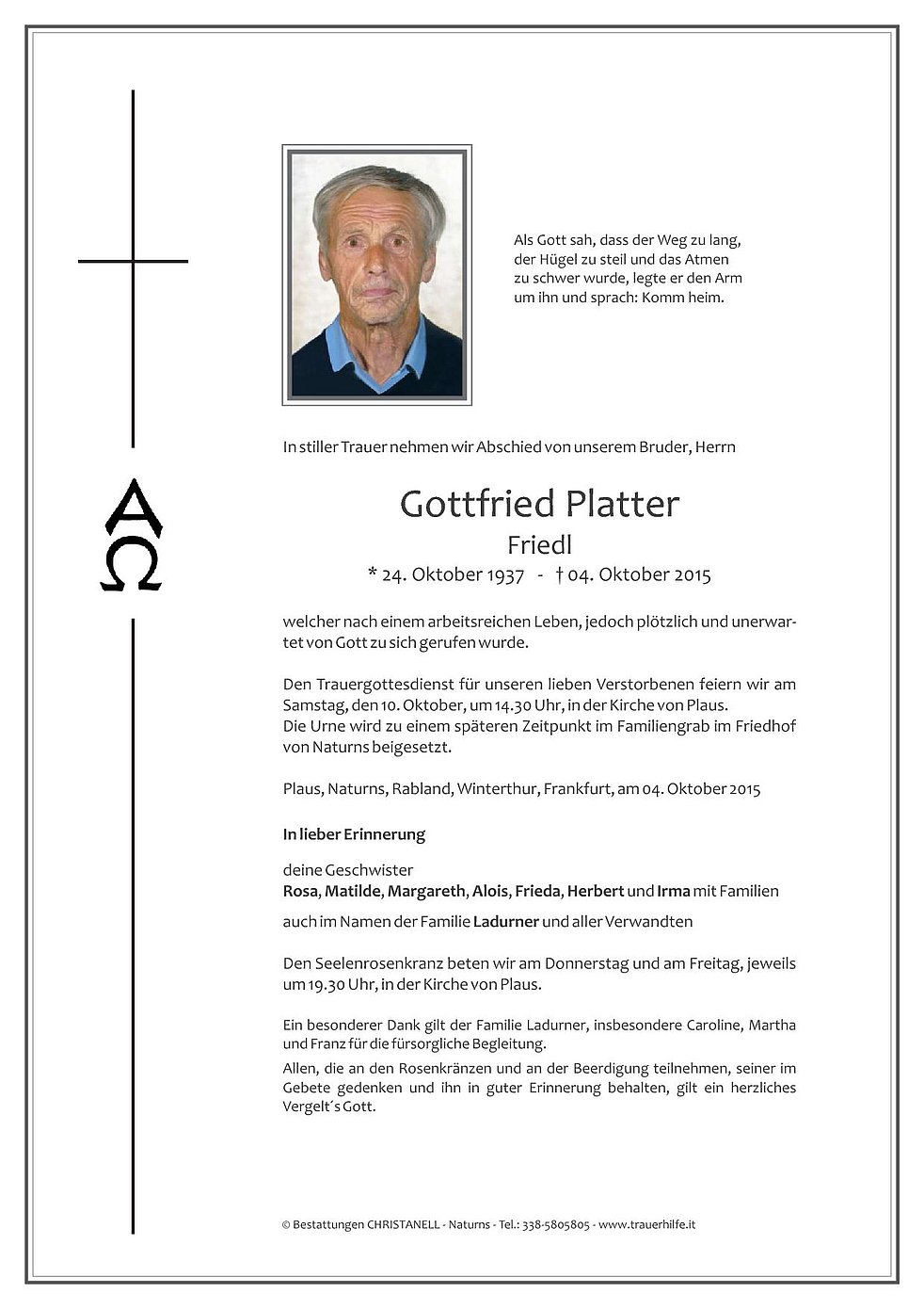 Den Trauergottesdienst für unseren lieben Verstorbenen feiern wir am Samstag, den 10. Oktober, um 14.30 Uhr, in der Kirche von Plaus.