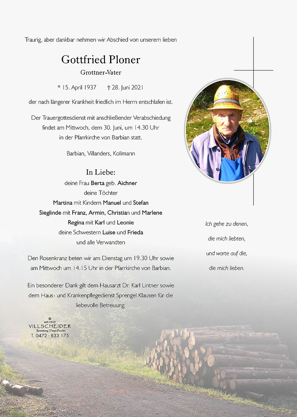 Im Namen der Mesner Gemeinschaft der Diözese Bozen-Brixen und im meinem persönlichen Namen spreche ich unserer Kassierin Martina und der Trauerfamilie Ploner mein aufrichtiges Beileid aus.