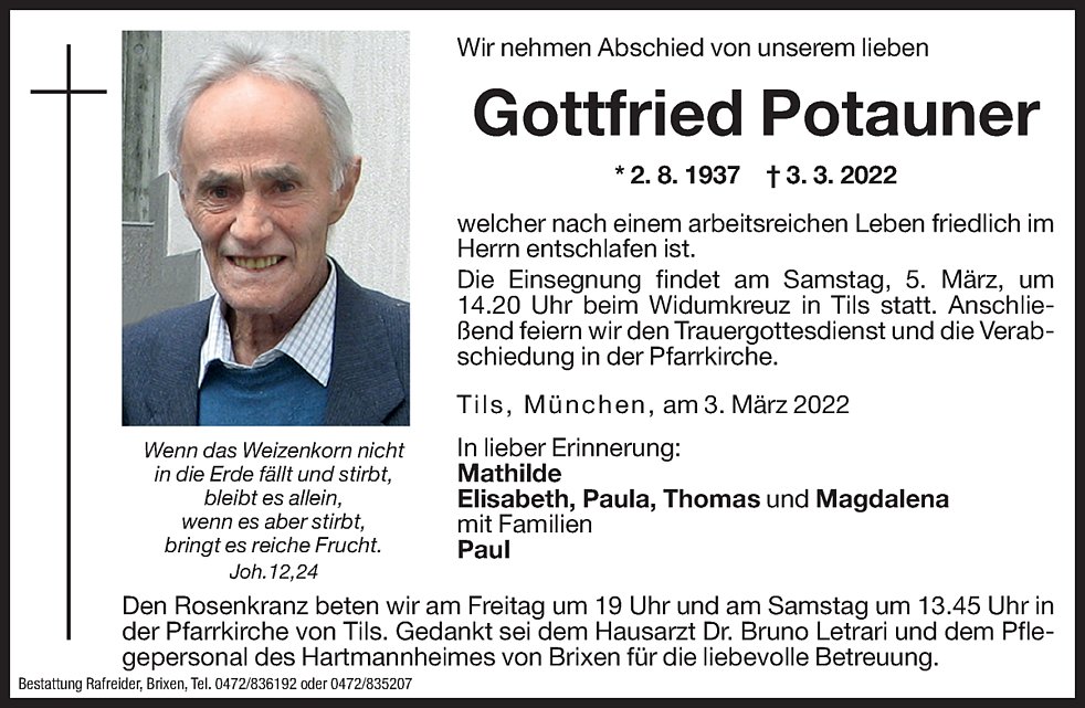 Die Einsegnung findet am Samstag, 5. März, um 14.20 Uhr beim Widum-Kreuz in Tils statt. Anschließend feiern wir den Trauergottesdienst und die Verabschiedung in der Pfarrkirche.