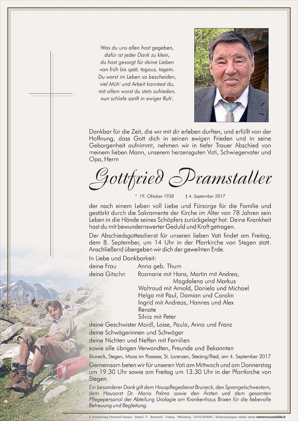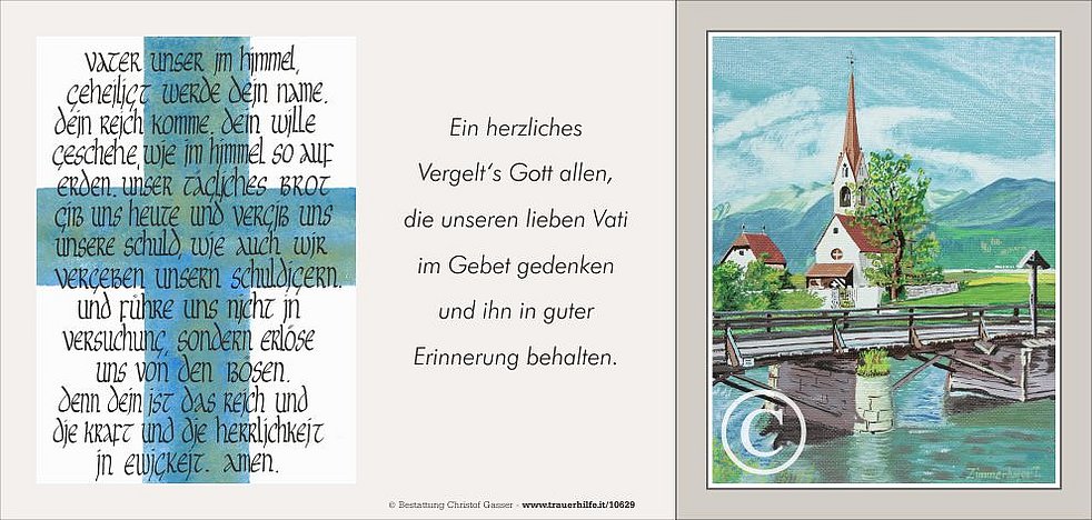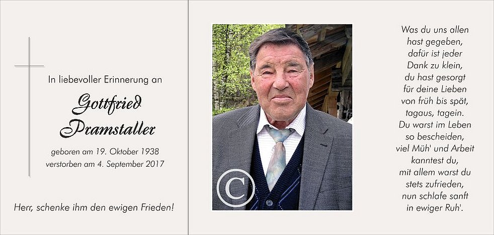 Der Abschiedsgottesdienst für unseren lieben Vati findet am Freitag, dem 8. September, um 14 Uhr in der Pfarrkirche von Stegen statt. Anschließend übergeben wir dich der geweihten Erde.