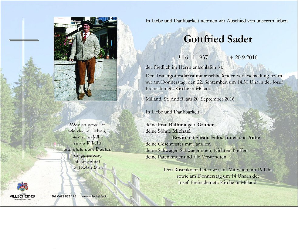 wir am Donnerstag, den 22. September, um 14.30 Uhr in der Josef Freinademetz Kirche in Milland.