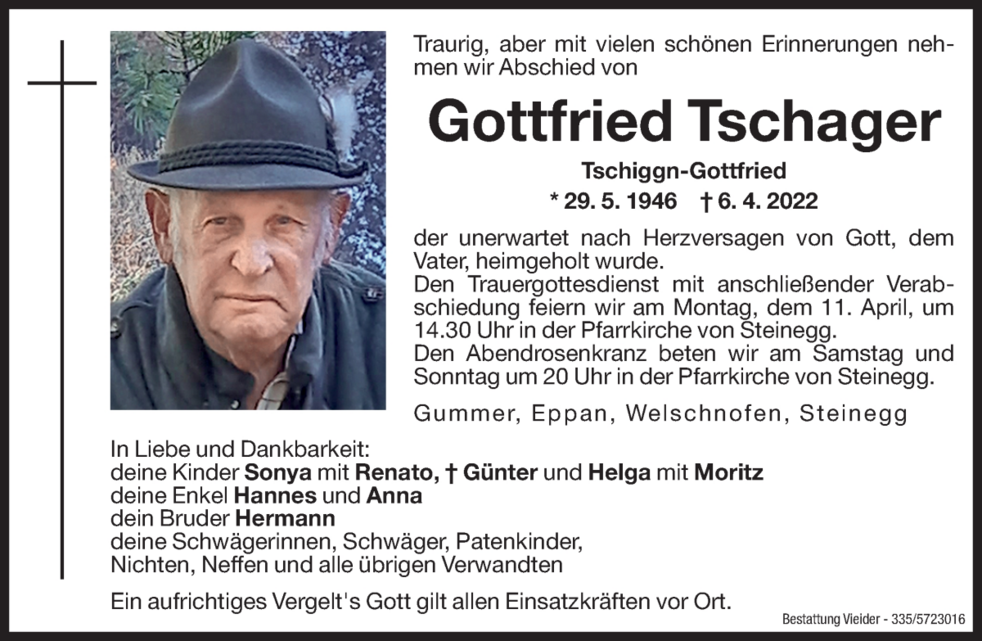 Den Trauergottesdienst mit anschließender Verabschiedung feiern wir am Montag, dem 11. April, um 14.30 in der Pfarrkirche von Steinegg