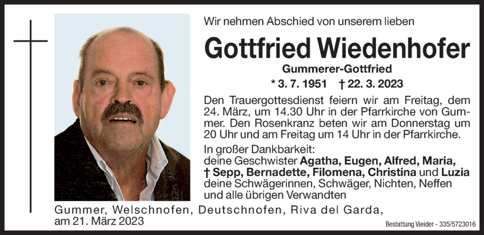 Den Trauergottesdienst feiern wir am Freitag, dem 24. März, um 14.30 Uhr in der Pfarrkirche von Gummer.