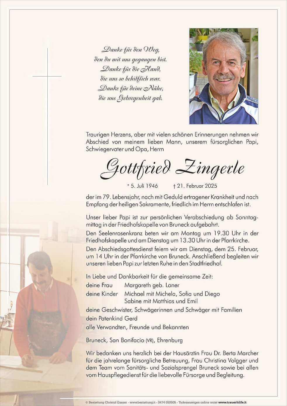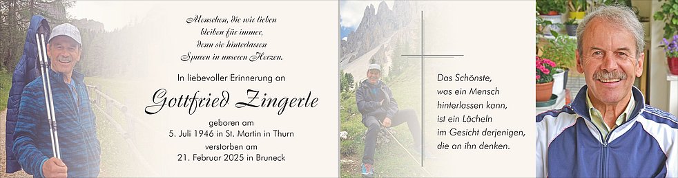 Den Abschiedsgottesdienst feiern wir am Dienstag, dem 25. Februar, um 14 Uhr in der Pfarrkirche von Bruneck. Anschließend begleiten wir unseren lieben Papi zur letzten Ruhe in den Stadtfriedhof.