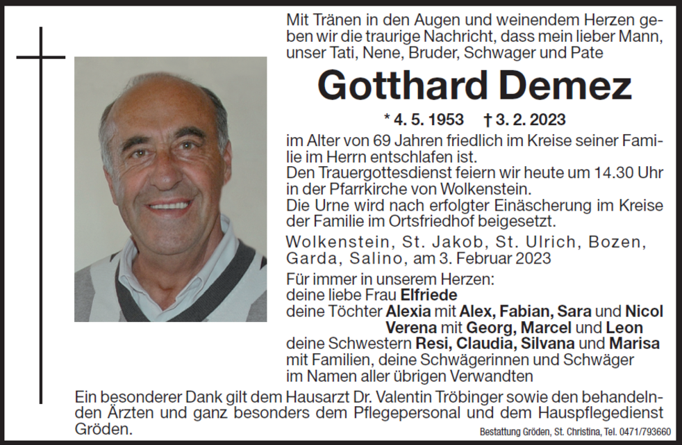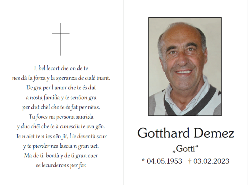 Ein besonderer Dank gilt dem Hausarzt Dr. Valentin Tröbinger, sowie den behandelnden Ärzten und ganz besonders dem Pflegepersonal und dem Hauspflegedienst Gröden.