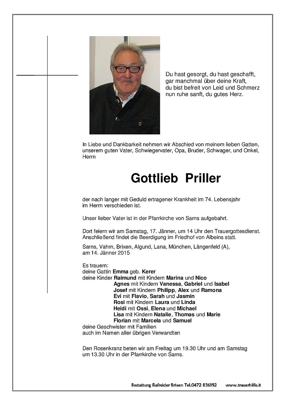 Gedankt sei dem Hausarzt Dr. Bruno Letrari, den Ärzten und dem Pflegepersonal der Abteilungen Medizin des Brixner Krankenhauses und der Überwachungsstation des Bozner Krankenhauses für die liebevolle Betreuung sowie allen, die an den Rosenkränzen, am Trauergottesdienst und an der Beerdigung teilnehmen.