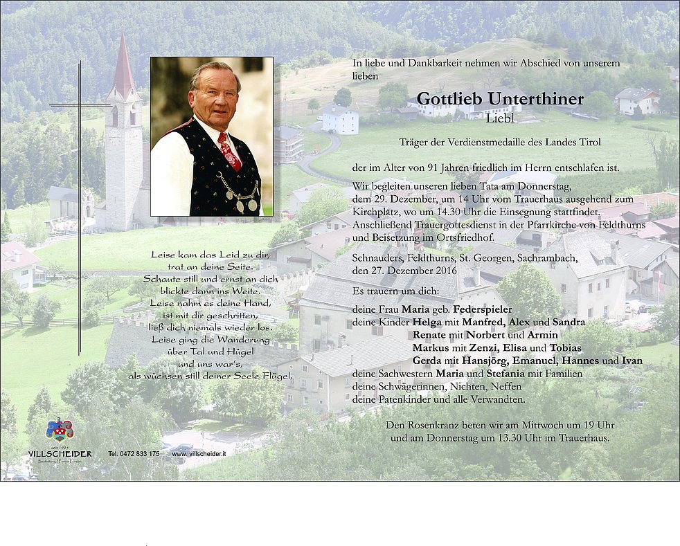 dem 29. Dezember, um 14 Uhr vom Trauerhaus ausgehend zum Kirchplatz, wo um 14.30 Uhr die Einsegnung stattfindet. Anschließend Trauergottesdienst in der Pfarrkirche von Feldthurns und Beisetzung im Ortsfriedhof.