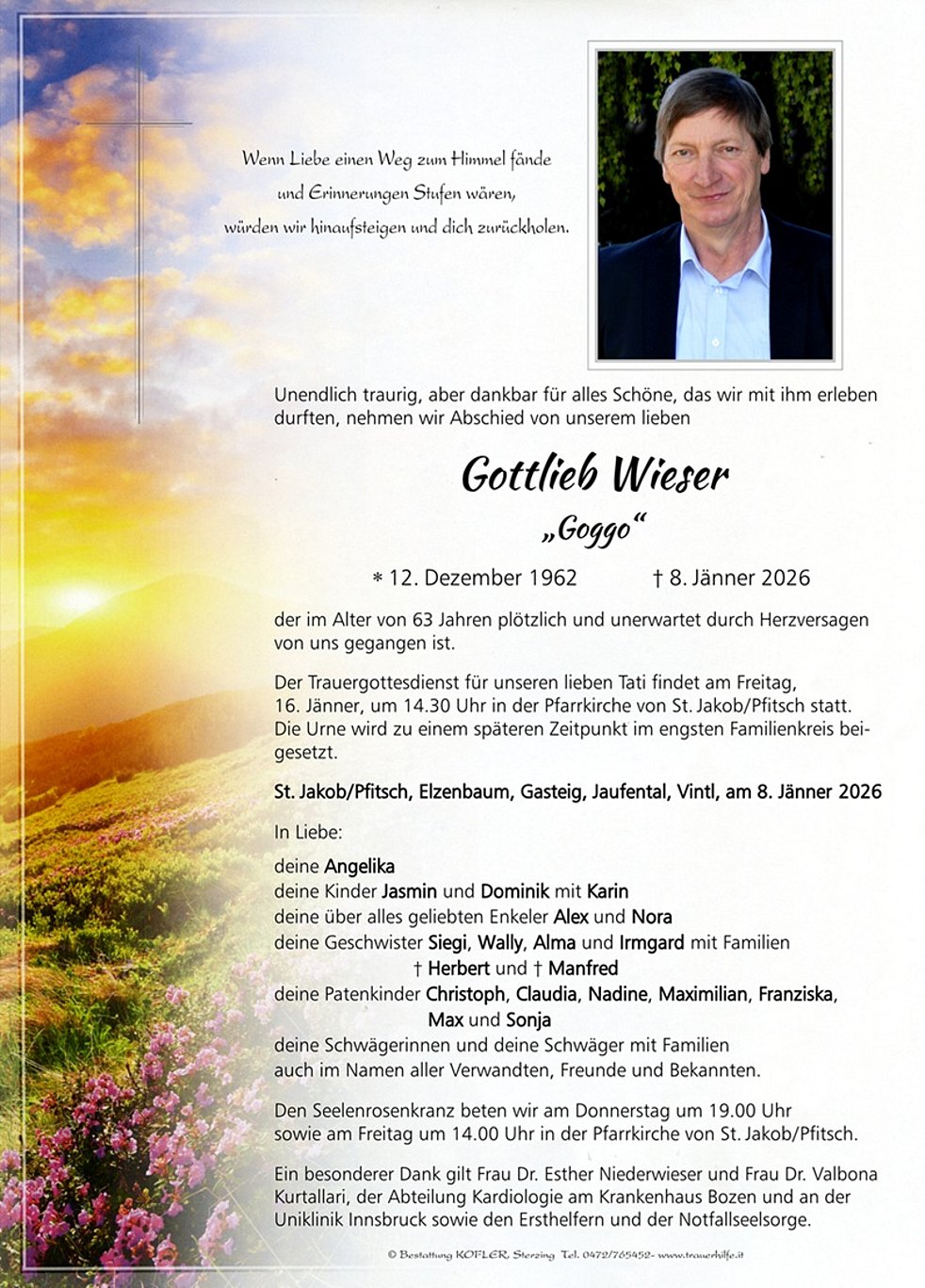 Der Trauergottesdienst für unseren lieben Tati findet am Freitag, 16. Jänner, um 14.30 Uhr in der Pfarrkirche von St. Jakob/Pfitsch statt. Die Urne wird zu einem späteren Zeitpunkt im engsten Familienkreis beigesetzt.