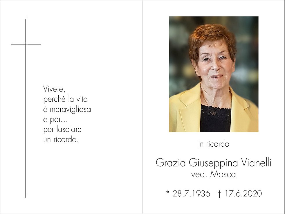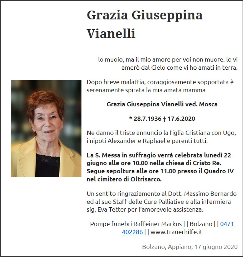La S. Messa in suffragio verrà celebrata lunedì 22 giugno alle ore 10.00 nella chiesa di Cristo Re. Segue sepoltura alle ore 11.00 presso il Quadro IV nel cimitero di Oltrisarco.