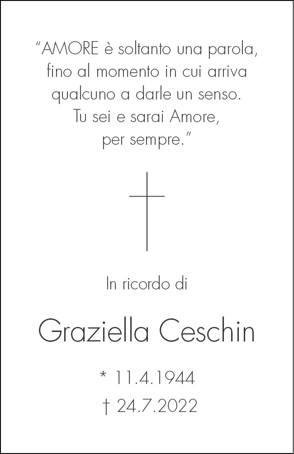 Lo annuncia la tua amata figlia Sonia con i nipoti Giorgia, Gioele e Gabriel, Massimo, la tua amata sorella Wilma con i nipoti Sabrina e Mirko, Michele e tutti quelli che ti hanno amata.
