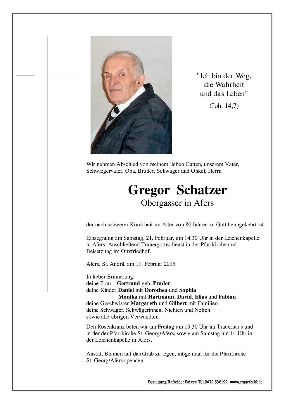 Den Rosenkranz beten wir am Freitag um 19.30 Uhr im Trauerhaus und in der der Pfarrkirche St. Georg/Afers, sowie am Samstag um 14 Uhr in der Leichenkapelle in Afers.