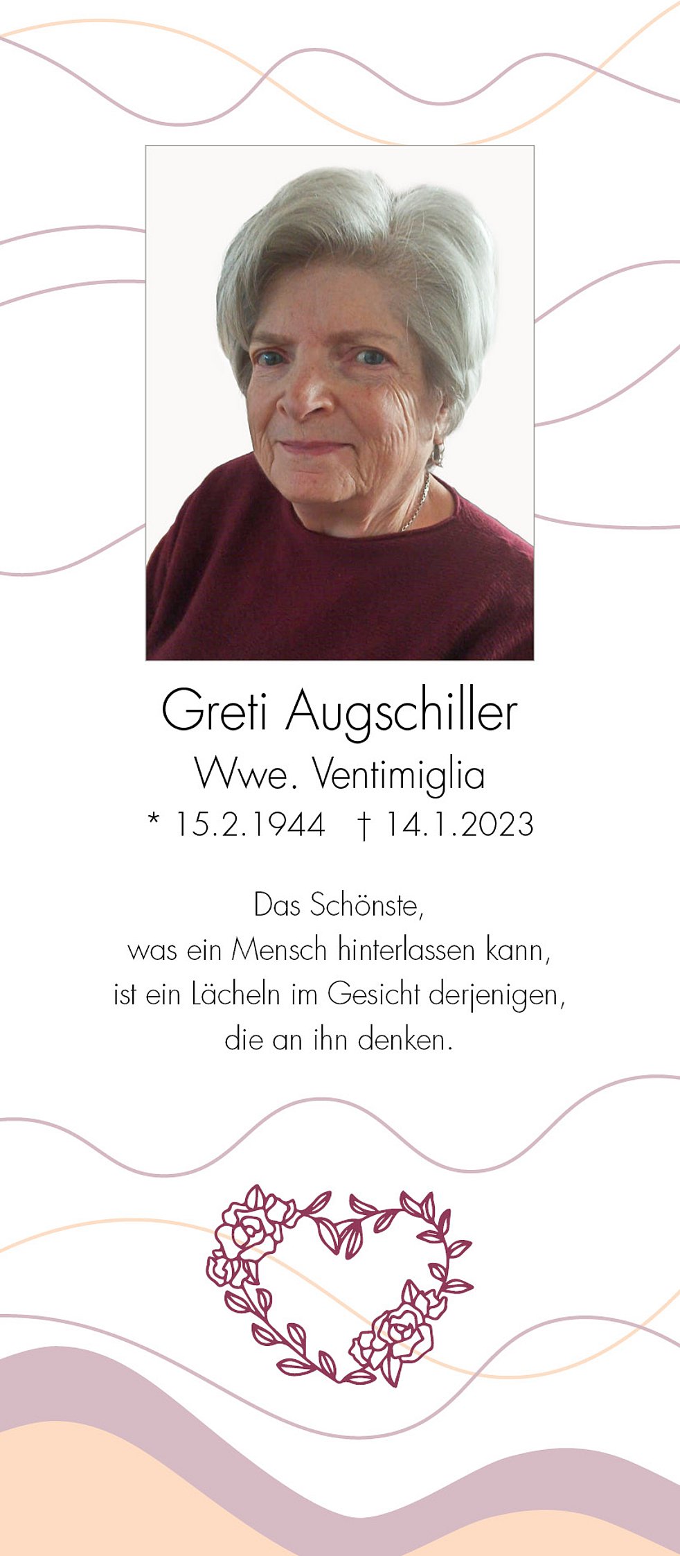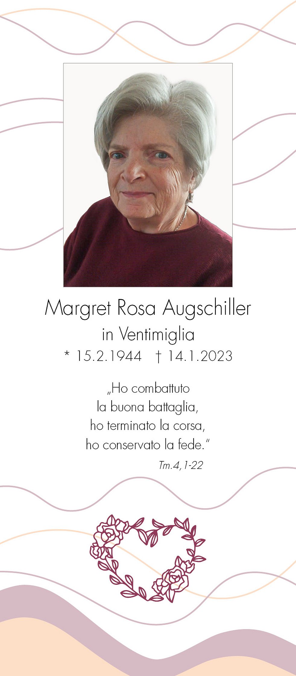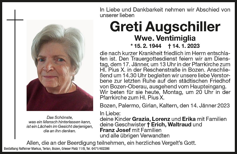 Den Trauergottesdienst feiern wir am Dienstag, dem 17. Jänner, um 13 Uhr in der Pfarrkirche zum Hl. Pius X. in der Reschenstraße in Bozen. Anschließend um 14.30 Uhr begleiten wir unsere liebe Verstorbene zur letzten Ruhe auf den städtischen Friedhof von Bozen-Oberau, ausgehend vom Haupteingang.