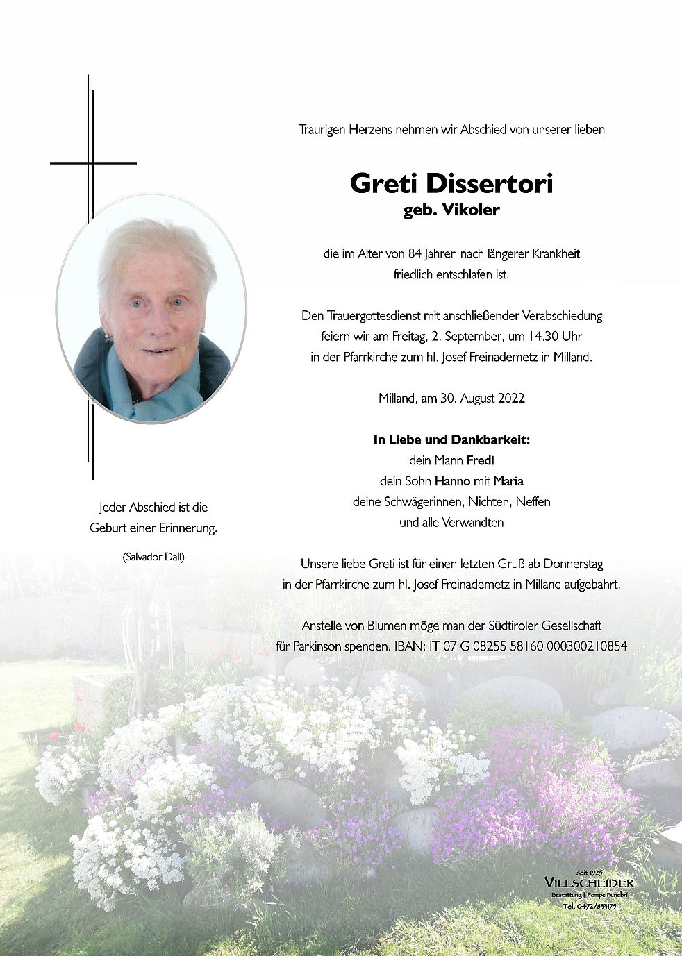 Mit Frau Greti Vikoler-Dissertori verläßt uns eine Millanderin, die vielen älteren Brixnern und Millandern noch gut in Erinnerung ist. Führte Sie doch, auch mit Ihrem Vater, zuerst in der Runggadgasse in Brixen und dann in Milland einen Friseur-