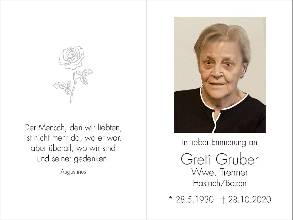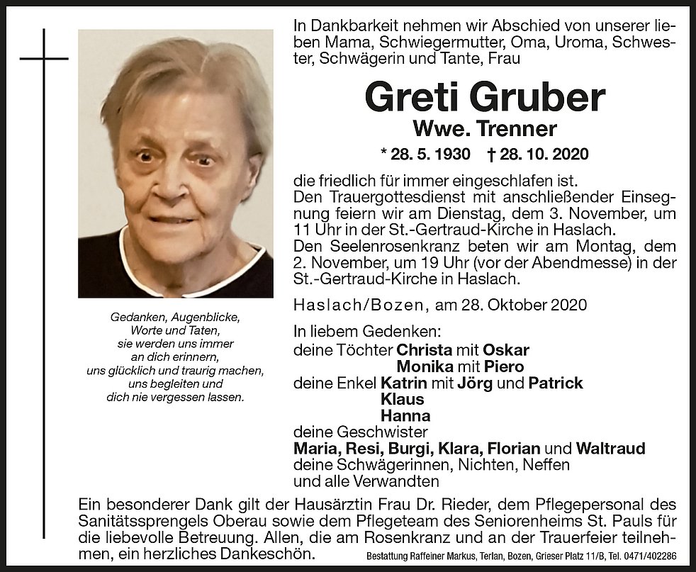 Ein besonderer Dank gilt der Hausärztin Frau Dr. Rieder, dem Pflegepersonal des Sanitätssprengels Oberau sowie dem Pflegeteam des Seniorenheims St. Pauls für die liebevolle Betreuung.