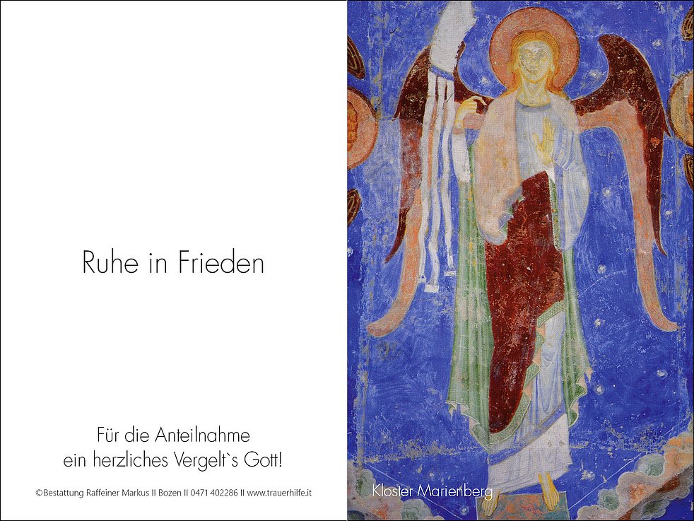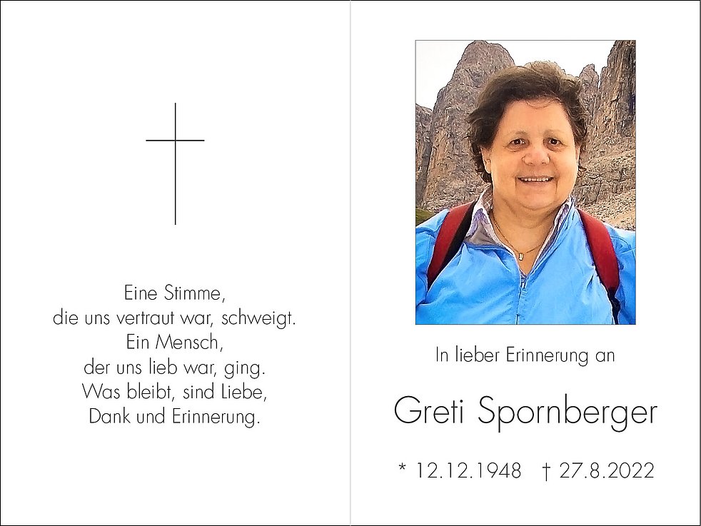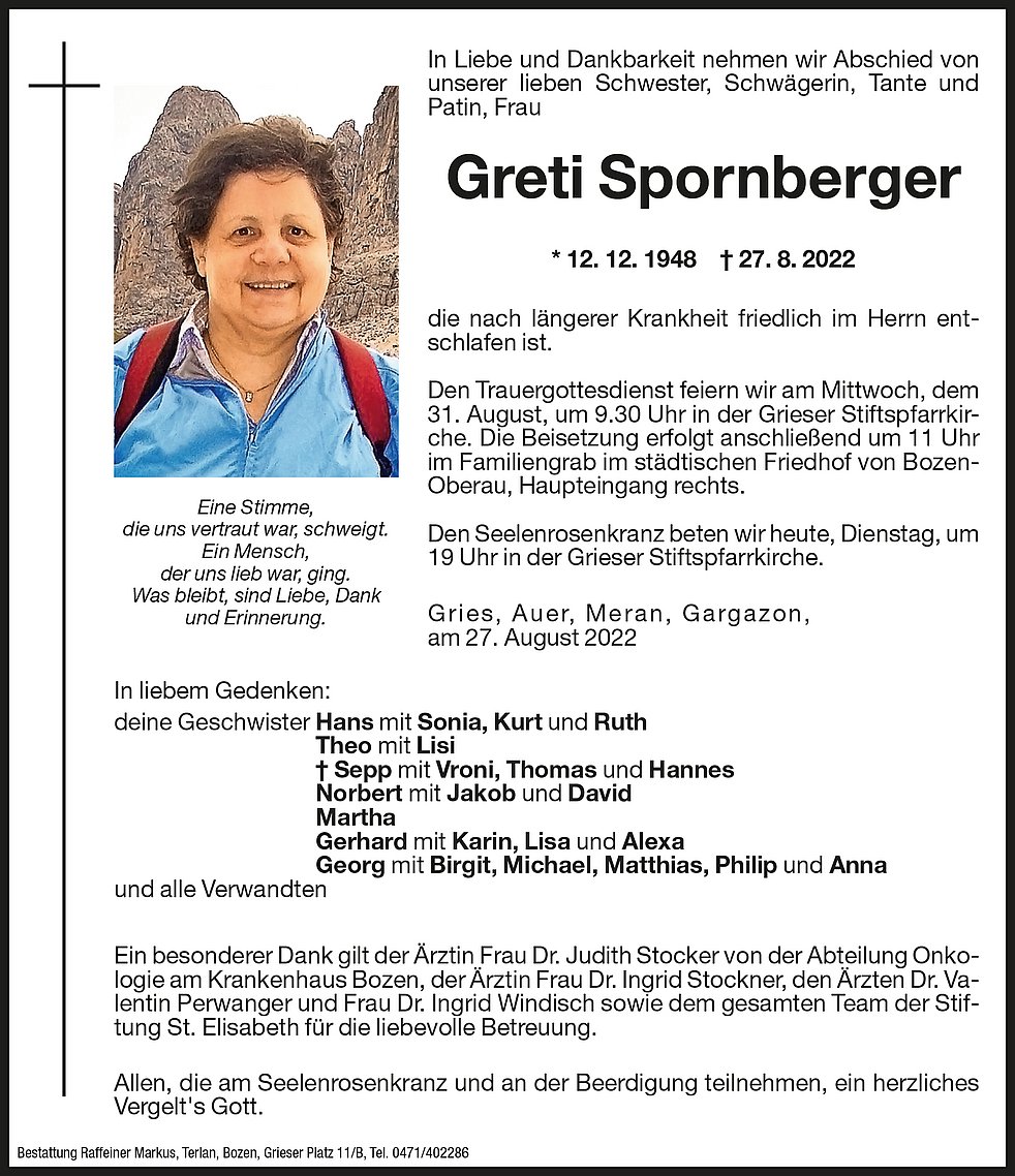 Den Trauergottesdienst feiern wir am Mittwoch, dem 31. August, um 9.30 Uhr in der Grieser Stiftspfarrkirche. Die Beisetzung erfolgt anschließend um 11 Uhr im Familiengrab am städtischen Friedhof von Bozen-Oberau, Haupteingang rechts.