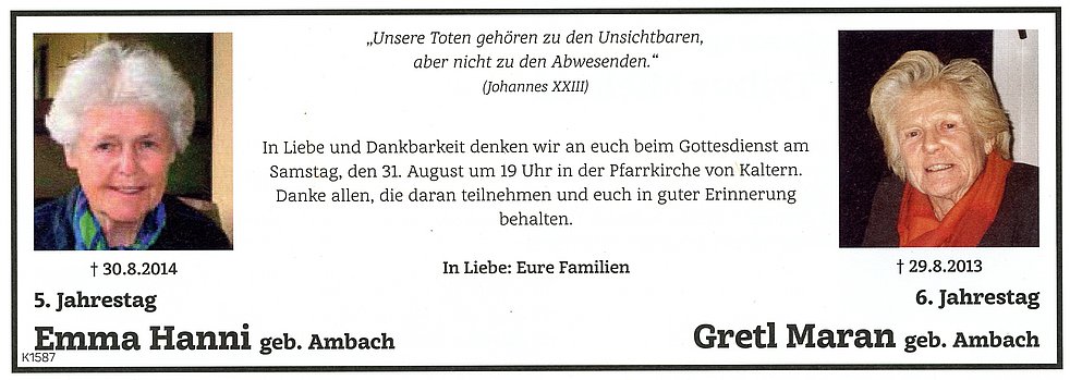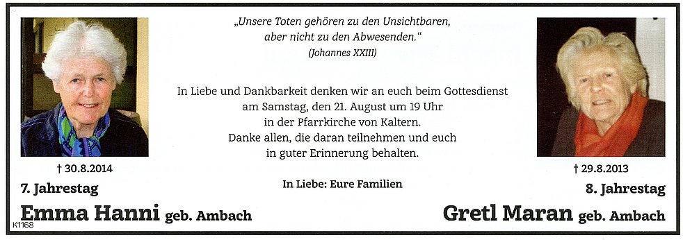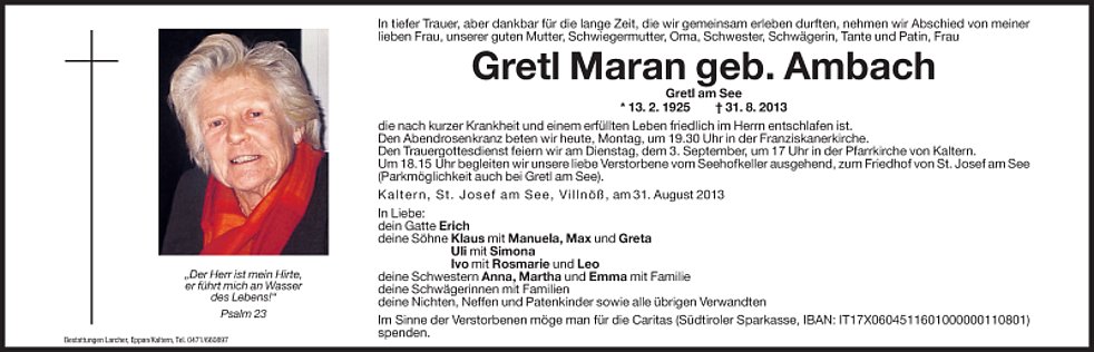 Im Sinne der Verstorbenen möge man für die Caritas (Südtiroler Sparkasse IBAN: IT17X0604511601000000110801) spenden.