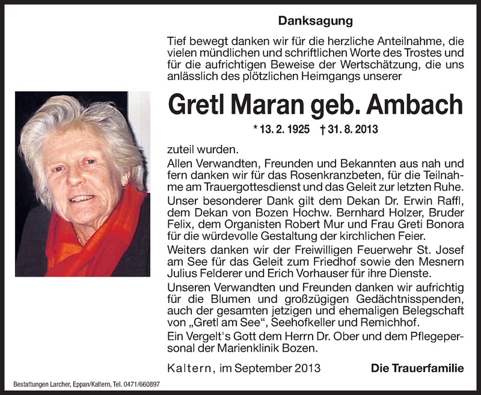 Den Trauergottesdienst feiern wir am Dienstag, den 3. September, um 17 Uhr, in der Pfarrkirche von Kaltern. Um 18.15 Uhr begleiten wir unsere liebe Verstorbene vom Seehofkeller ausgehend zum Friedhof von St. Josef am See ( Parkmöglichkeit auch bei Gretl am See).