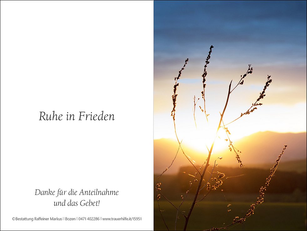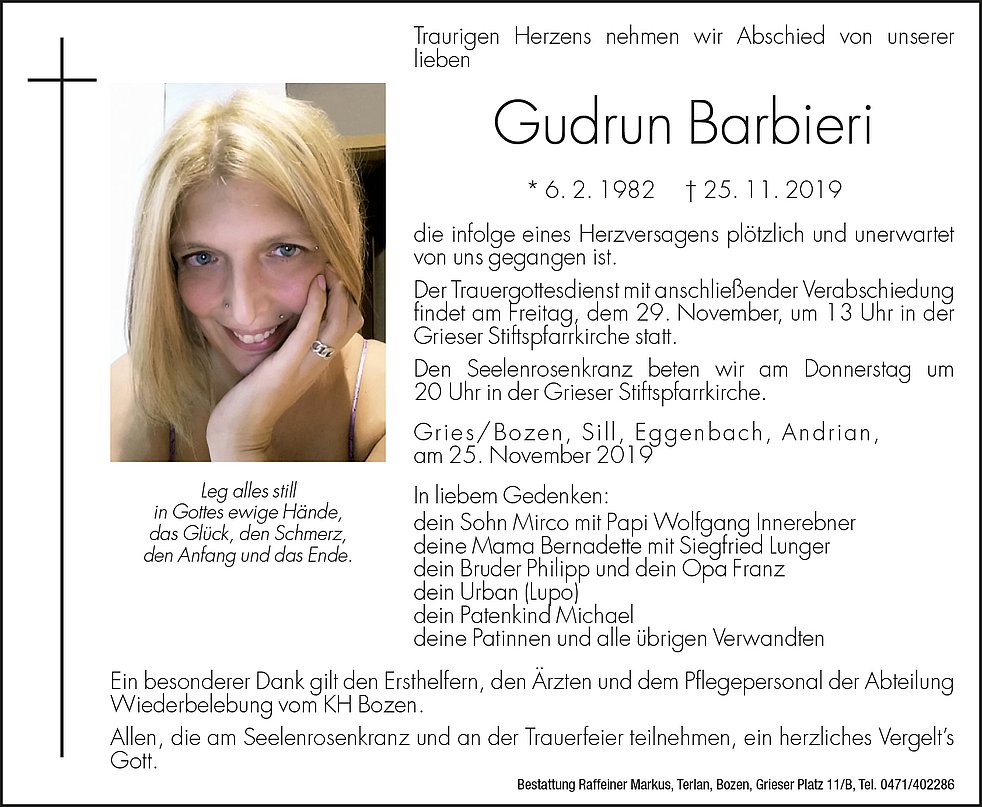 Ein besonderer Dank gilt den Ersthelfern, den Ärzten und dem Pflegepersonal der Abteilung Wiederbelebung vom KH Bozen.