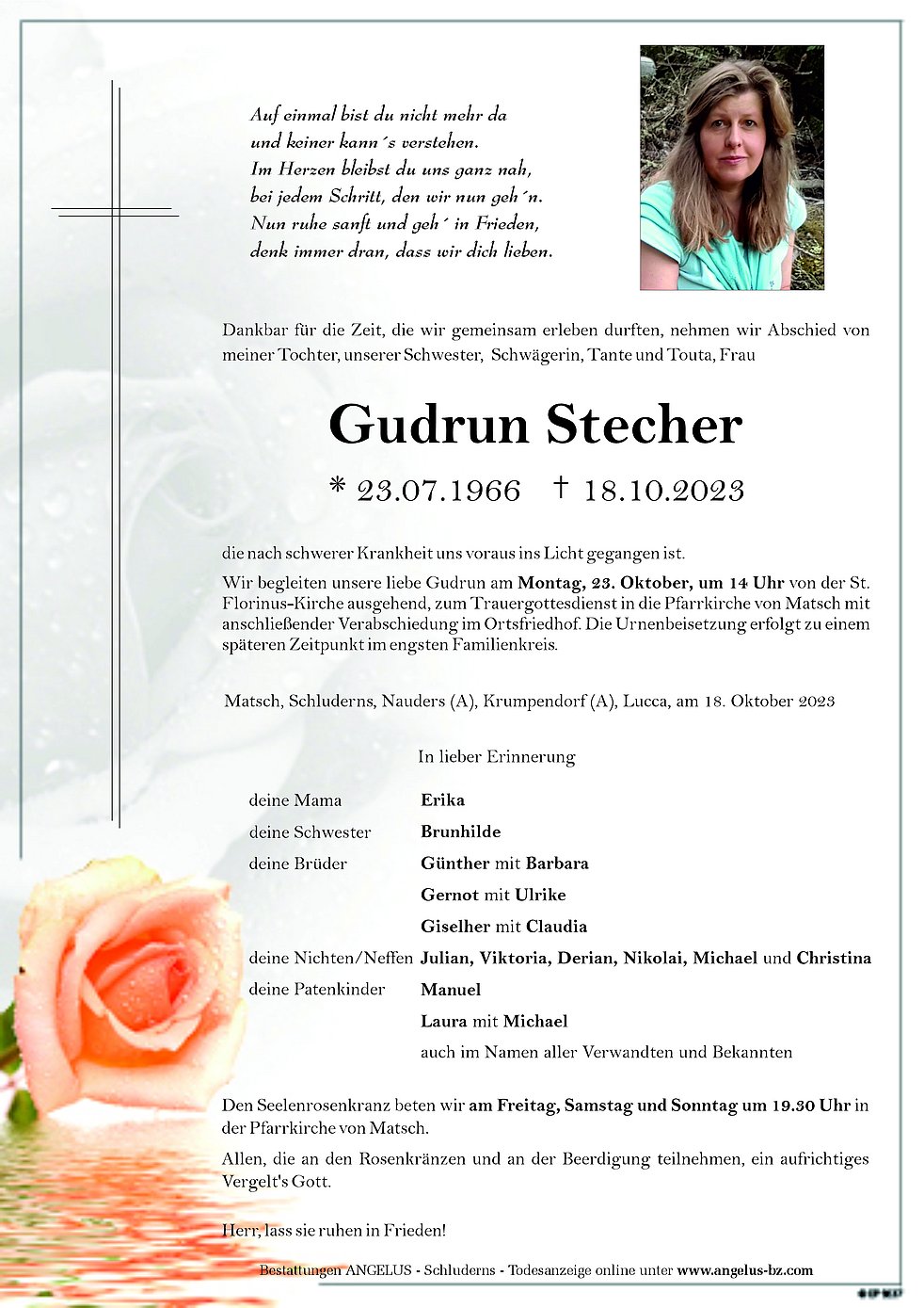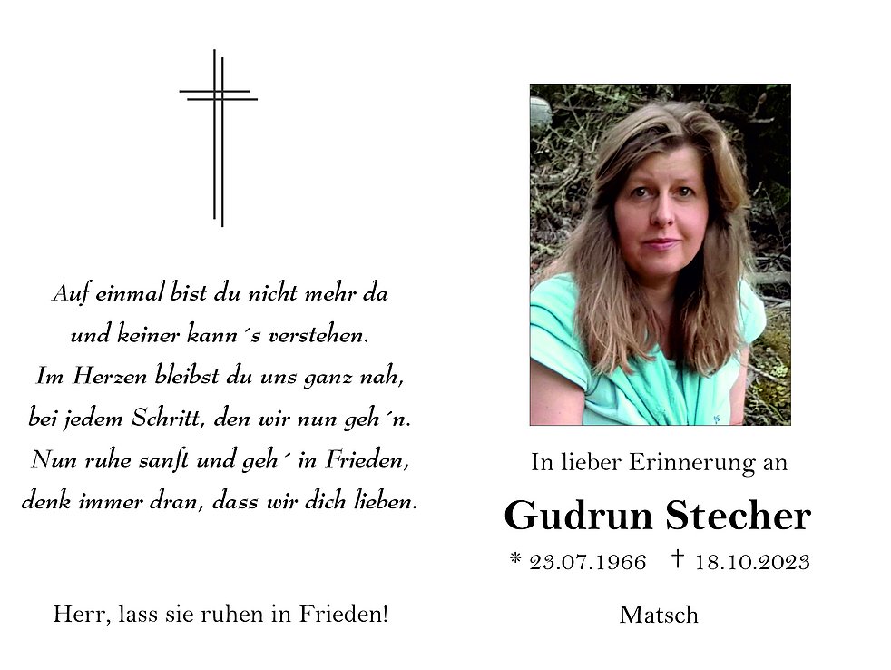 Liebe Gudrun, wir haben Dich leider nicht kennengelernt, aber deinen Bruder Gerbot haben wir in Österreich kennenlernen dürfen, wir wünschen ihm und seiner Familie unser aufrichtiges Beileid. Roland Rizzi und Markt Imelda