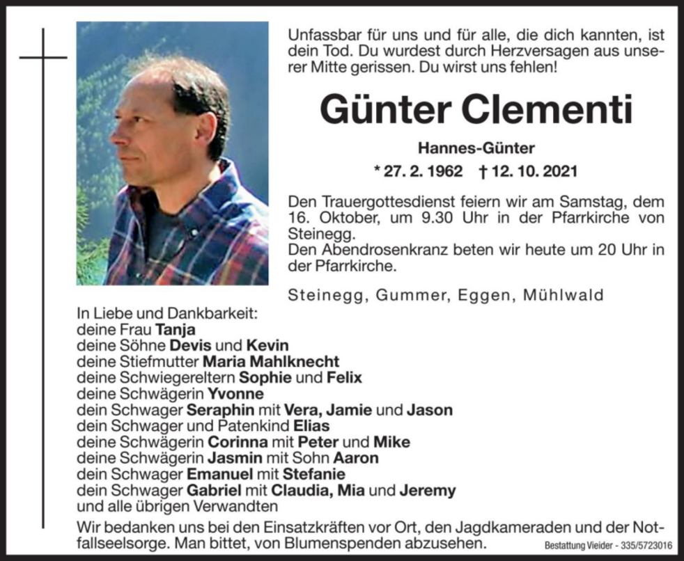 Den Trauergottesdienst feiern wir am Samstag, dem 16. Oktober, um 9.30 Uhr in der Pfarrkirche von Steinegg.