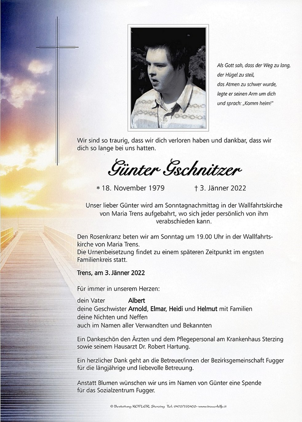 Unser lieber Günter wird am Sonntagnachmittag in der Wallfahrtskirche von Maria Trens aufgebahrt, wo sich jeder persönlich von ihm verabschieden kann.