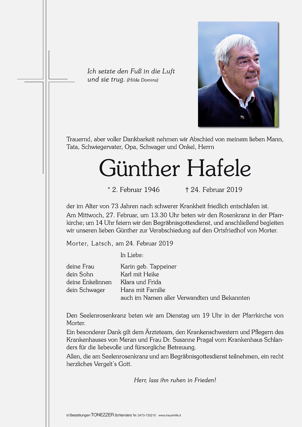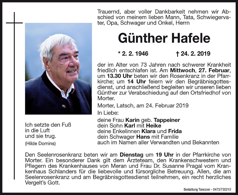 Am Mittwoch, 27. Februar, um 13.30 Uhr beten wir den Rosenkranz; um 14 Uhr feiern wir den Begräbnisgottesdienst in der Pfarrkirche, und anschließend begleiten wir unseren lieben Günther zur Verabschiedung auf den Ortsfriedhof von Morter.