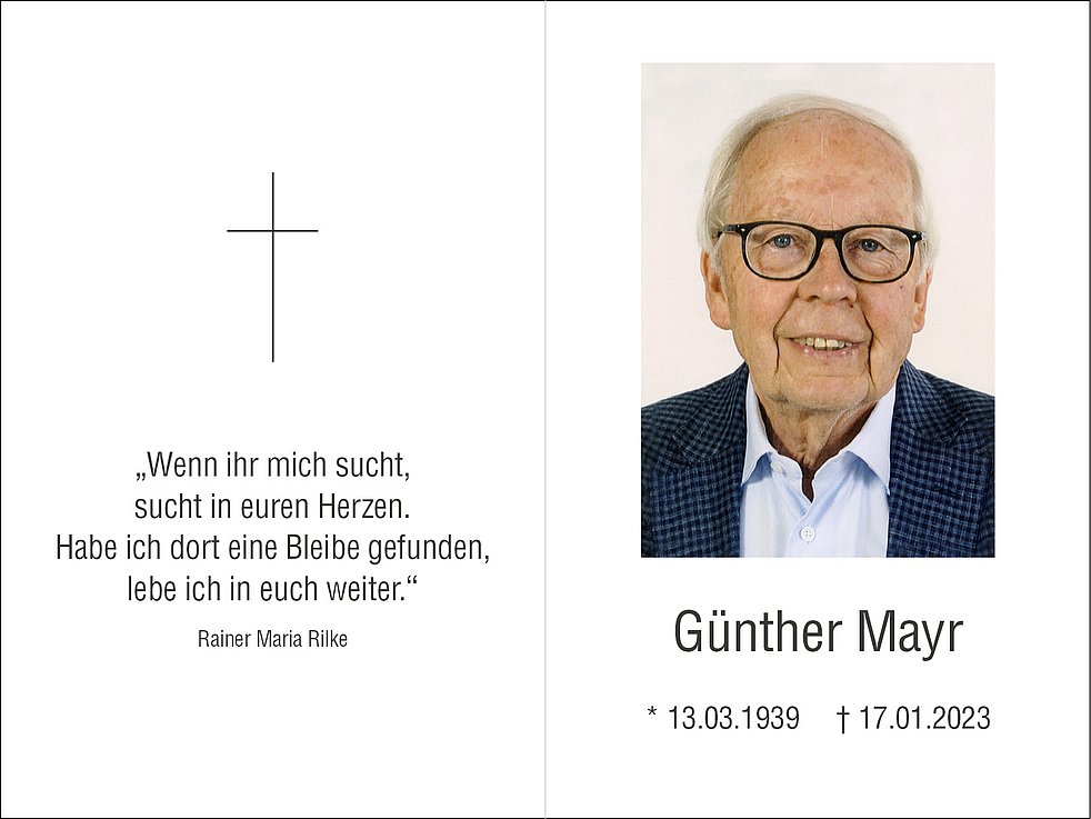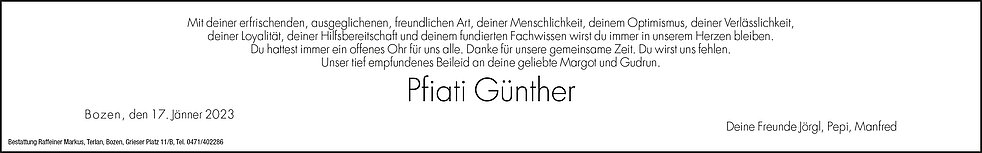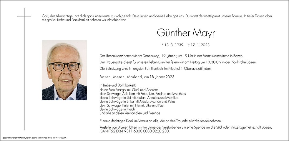 Den Trauergottesdienst für unseren lieben Günther feiern wir am Freitag um 13.30 Uhr in der Pfarrkirche Bozen.
