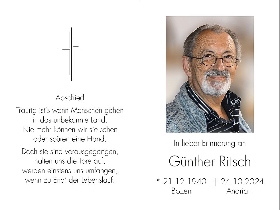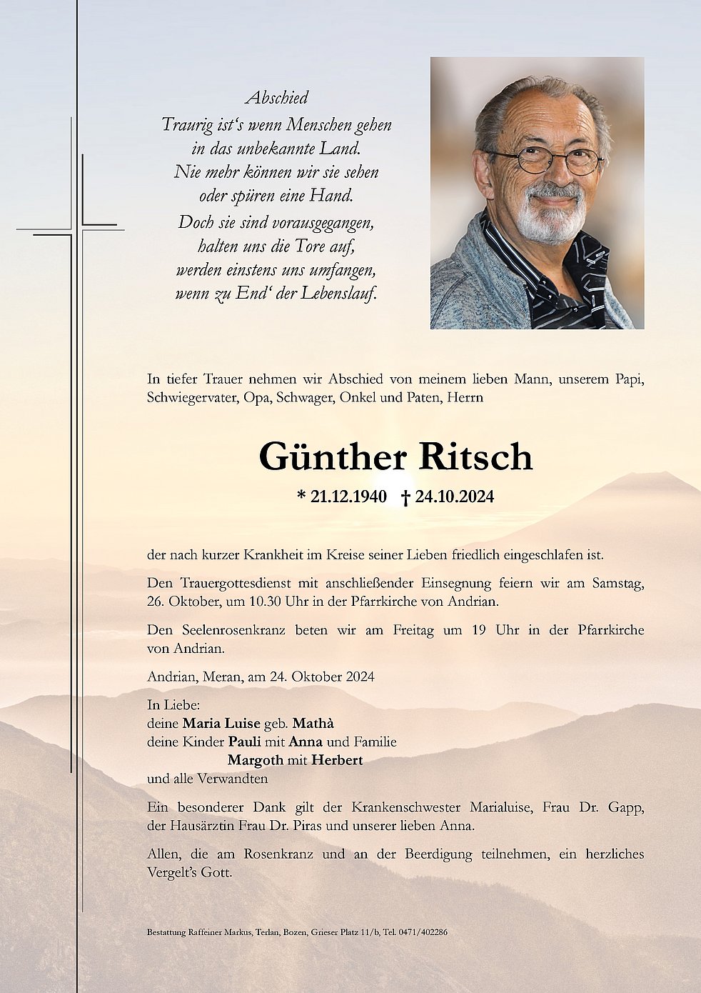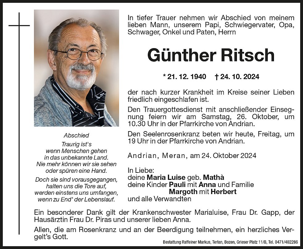 Den Trauergottesdienst mit anschließender Einsegnung feiern wir am Samstag, 26. Oktober, um 10.30 Uhr in der Pfarrkirche von Andrian.