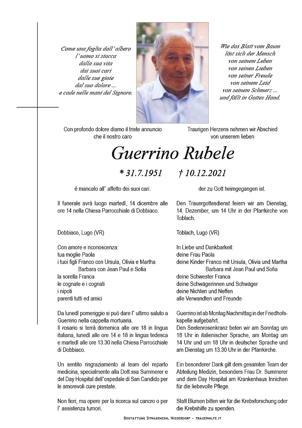 Il funerale avrà luogo martedì, 14 dicembre alle ore 14 nella Chiesa Parrocchiale di Dobbiaco.