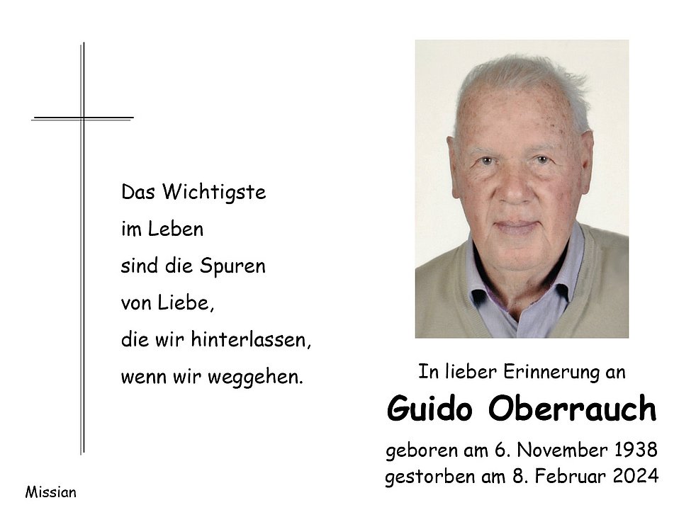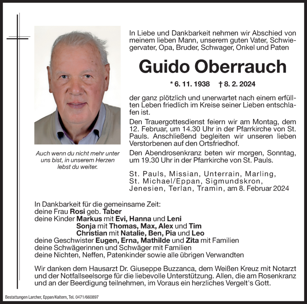 Den Trauergottesdienst feiern wir am Montag, dem 12. Februar, um 14.30 Uhr in der Pfarrkirche von St. Pauls. Anschließend begleiten wir unseren lieben Verstorbenen auf den Ortsfriedhof.