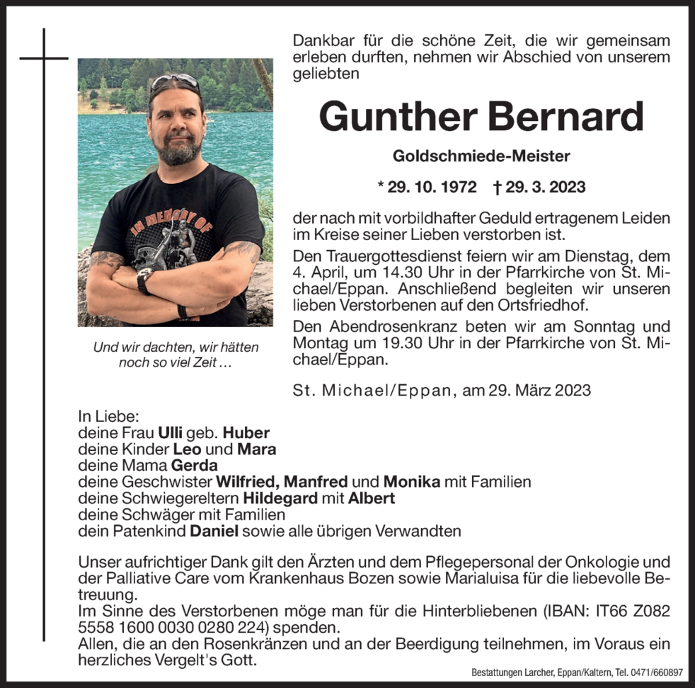 Den Trauergottesdienst feiern wir am Dienstag, dem 4. April um 14.30 Uhr in der Pfarrkirche von St. Michael/Eppan. Anschließend begleiten wir unseren lieben Verstorbenen auf den Ortsfriedhof.