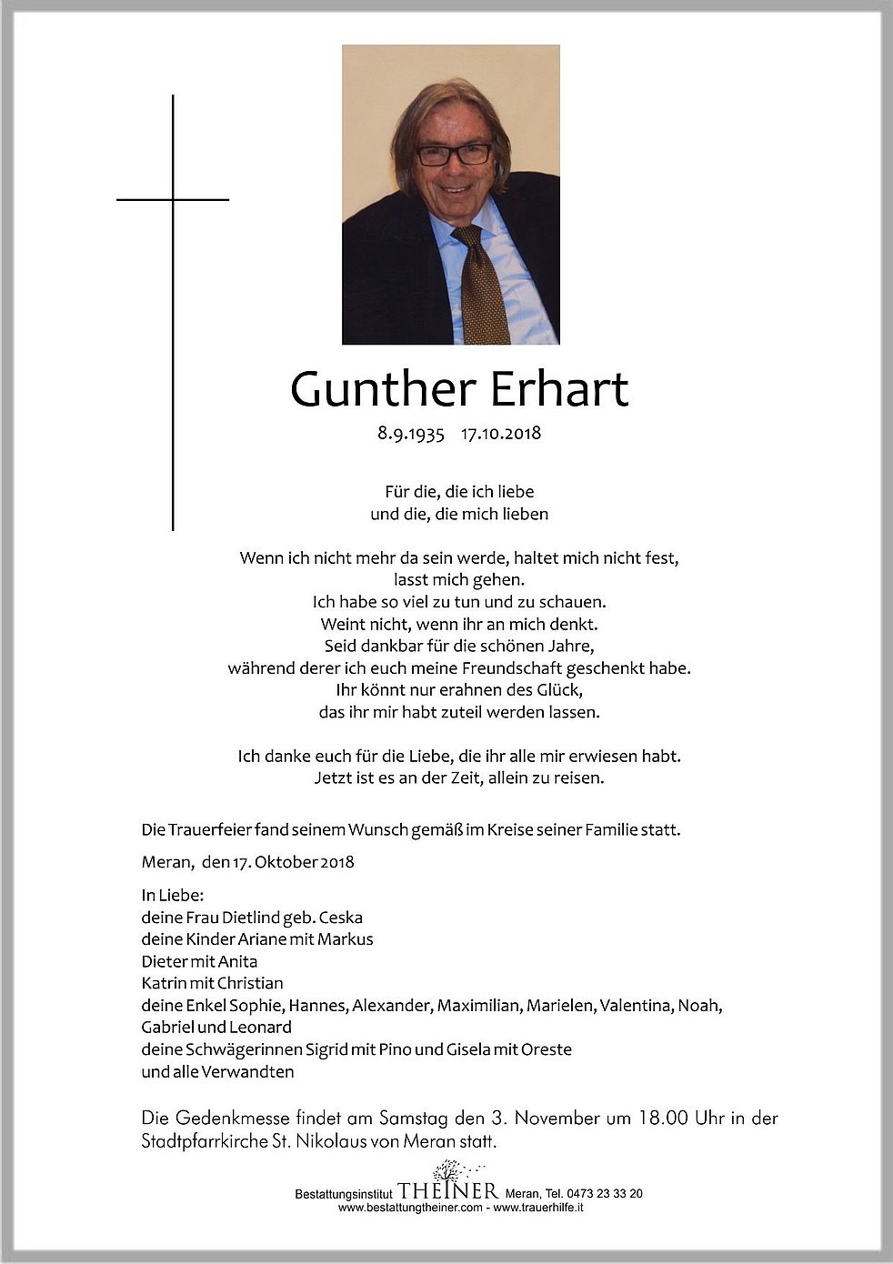 Die Gedenkmesse findet am Samstag den 3. November um 18.00 Uhr in der Stadtpfarrkirche St. Nikolaus von Meran statt.