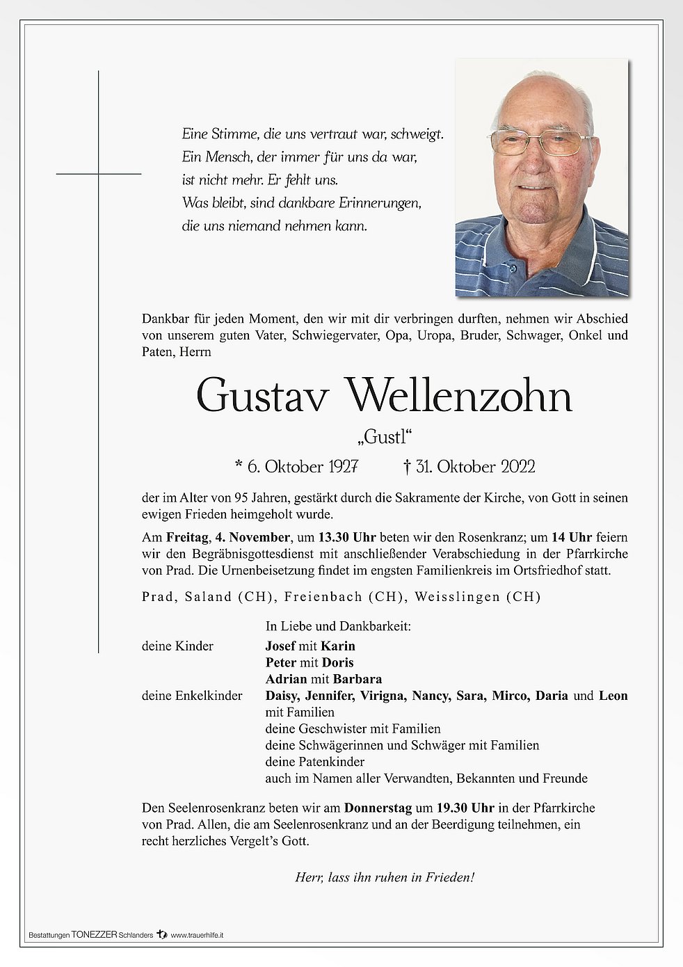 Am Freitag, 4. November, um 13.30 Uhr beten wir den Rosenkranz; um 14 Uhr feiern wir den Begräbnisgottesdienst mit anschließender Verabschiedung in der Pfarrkirche von Prad.