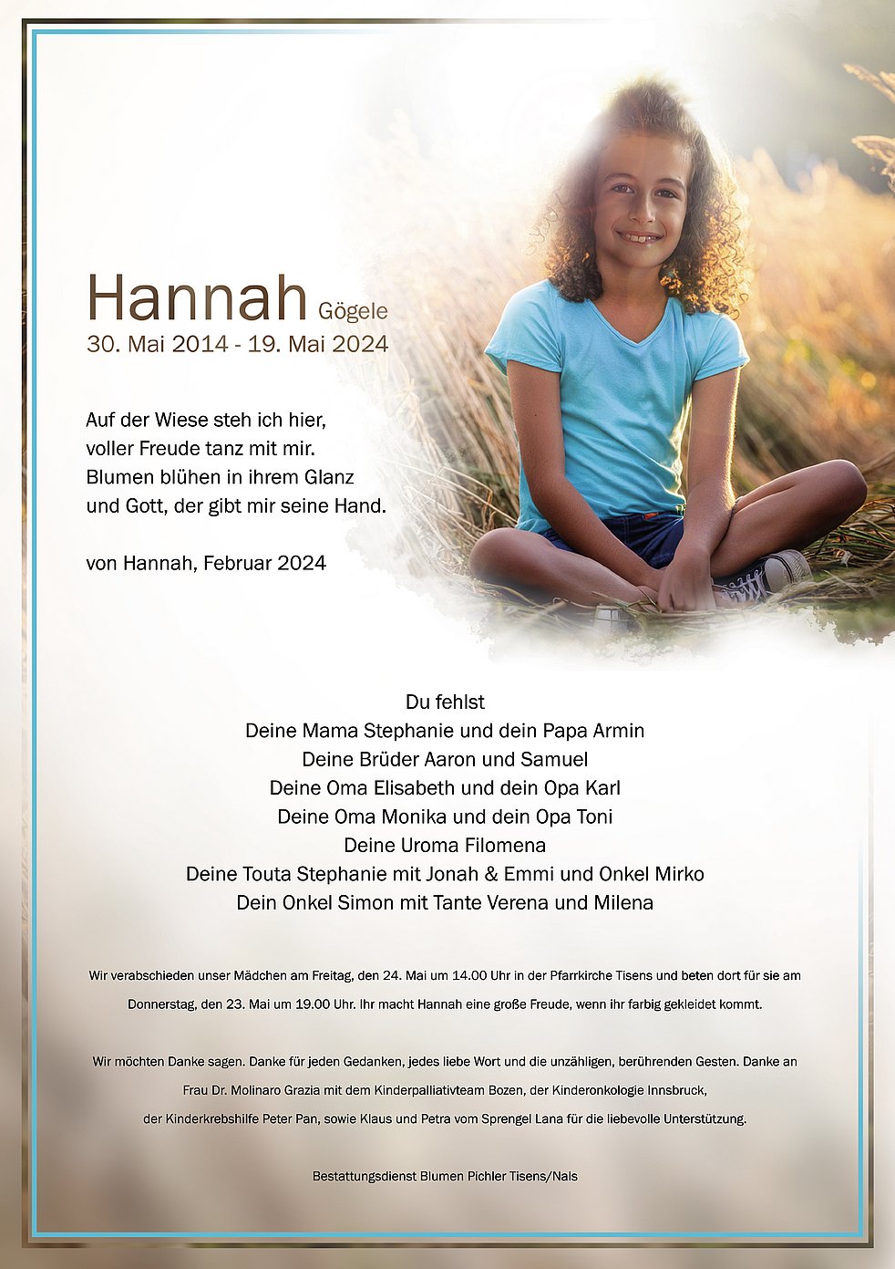 Wir sind nur Gast auf Erden. Hannah deine irdische reise wor leider viel zu früh am ende. Du bisch iatz a schutzengele ❤gonz gonz viel kroft in di eltern 🙏 ❤🙏Eine mitfühlende mamma