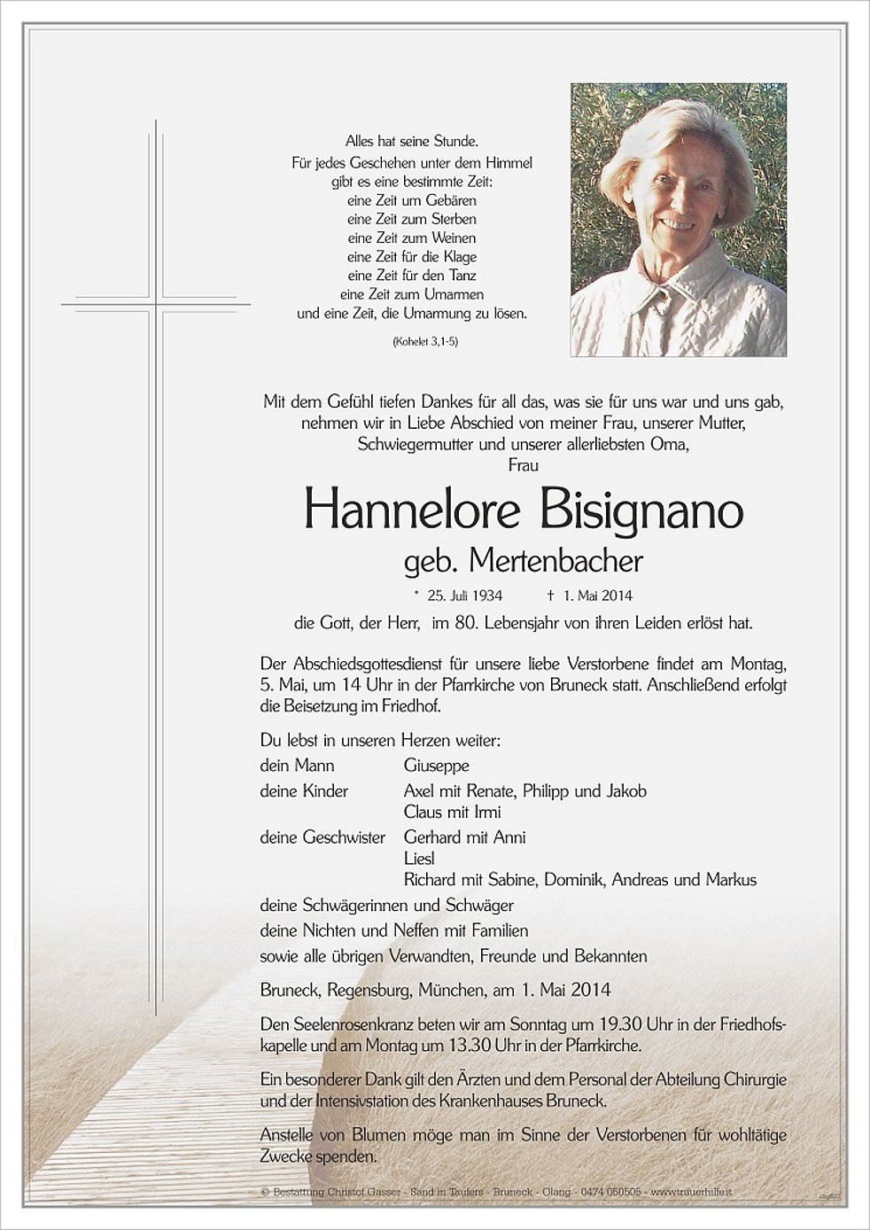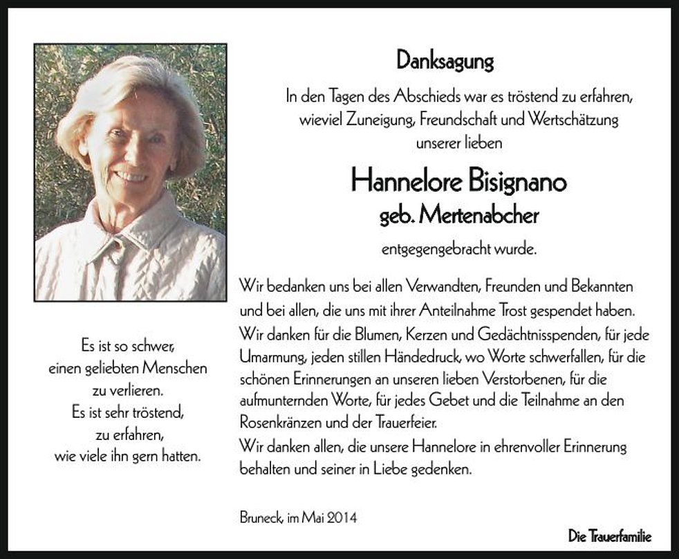 Mit dem Gefühl tiefen Dankes für all das, was sie für uns war und uns gab, nehmen wir in Liebe Abschied von meiner Frau, unserer Mutter, Schwiegermutter und unserer allerliebsten Oma, Frau