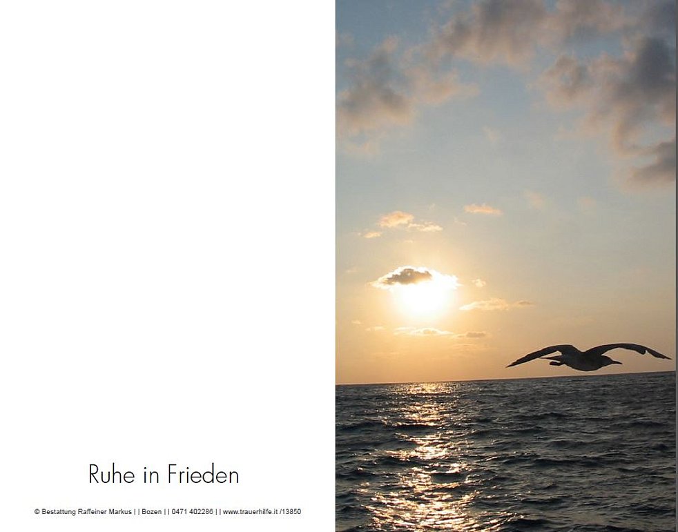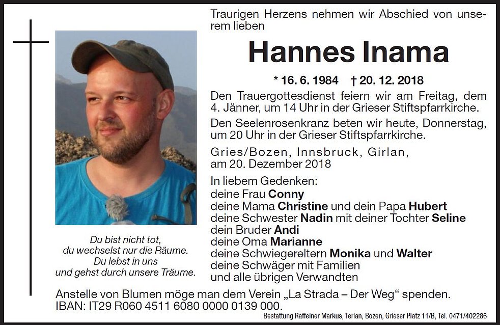Anstelle von Blumen, möge man dem Verein „La Strada - Der Weg“ spenden. IBAN: IT29R0604511608000000139000
