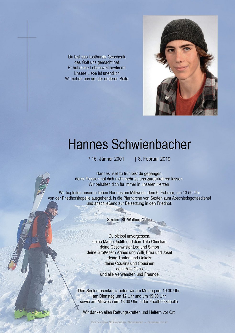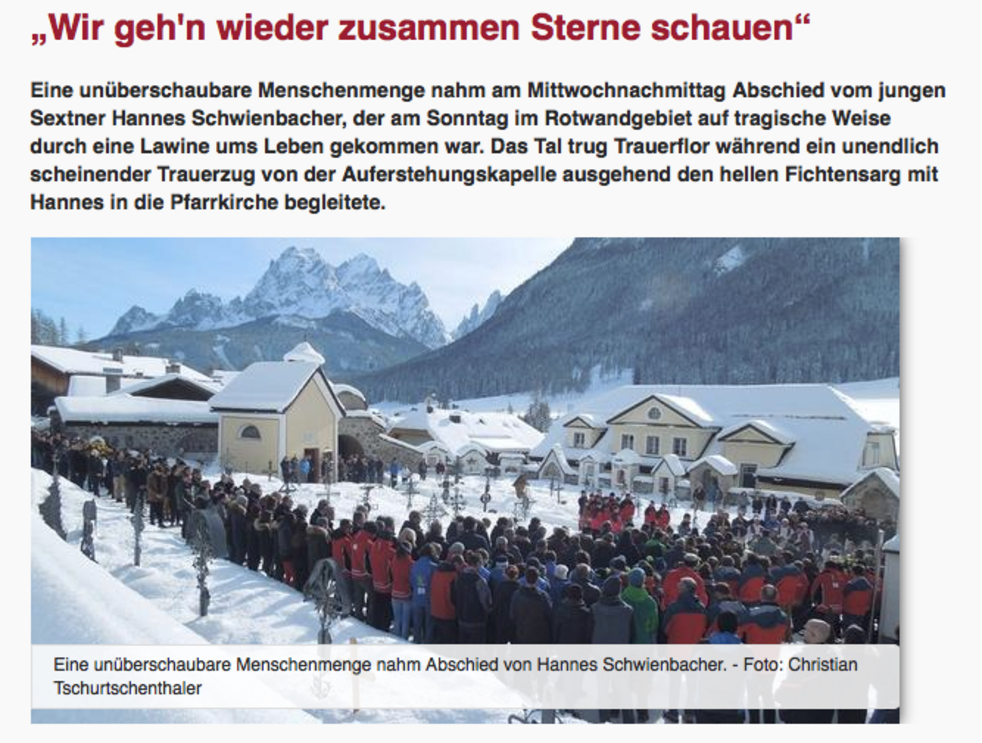 Wir begleiten unseren lieben Hannes am Mittwoch, dem 6. Februar, um 13.50 Uhr von der Friedhofskapelle ausgehend, in die Pfarrkirche von Sexten zum Abschiedsgottesdienst und anschließend zur Beisetzung in den Friedhof.