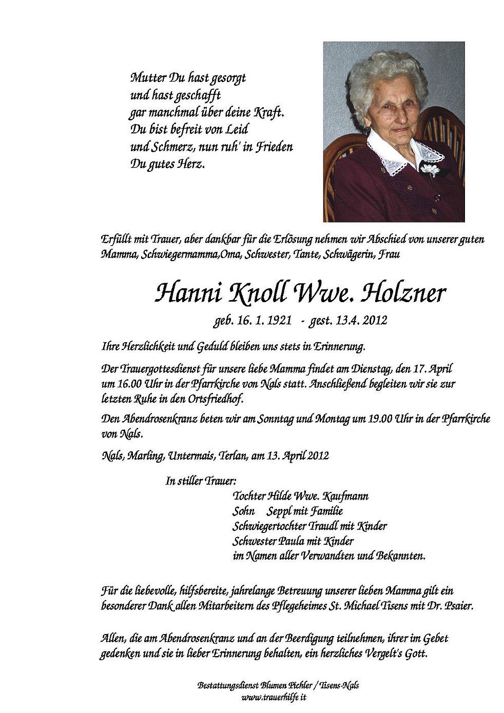 Der Trauergottesdienst für unsere liebe Mamma findet am Dienstag, den 17. April