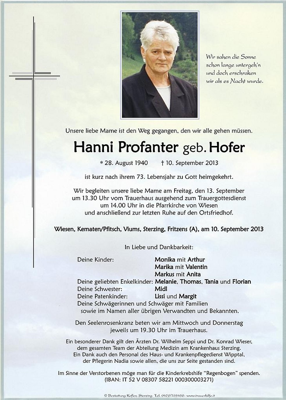 Im Sinne der Verstorbenen möge man für die Kinderkrebshife “Regenbogen” spenden.